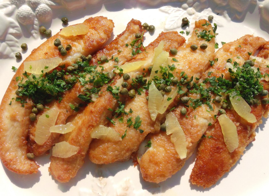Sauteed Flounder Fillet “Grenobloise” ← Previous Next → top the fish with the lemon fillets, 2 tblsp capers and 2 tblsp chopped Italian parsley