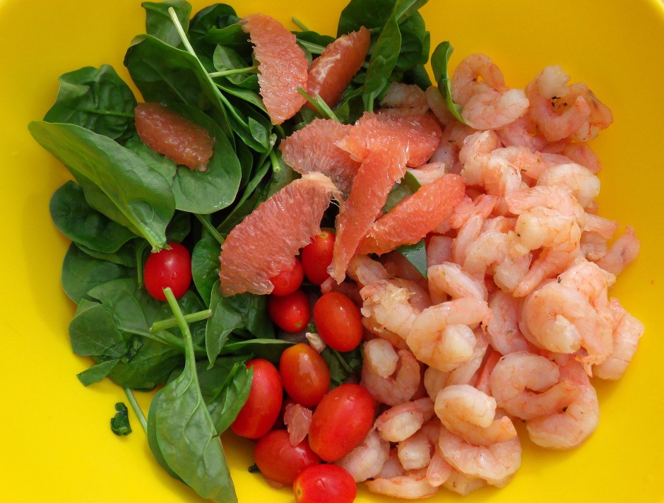 6 ← Previous Next → add grapefruit and avocado to 8 oz spinach, 8 ea grape tomatoes and 8 oz salad shrimp
