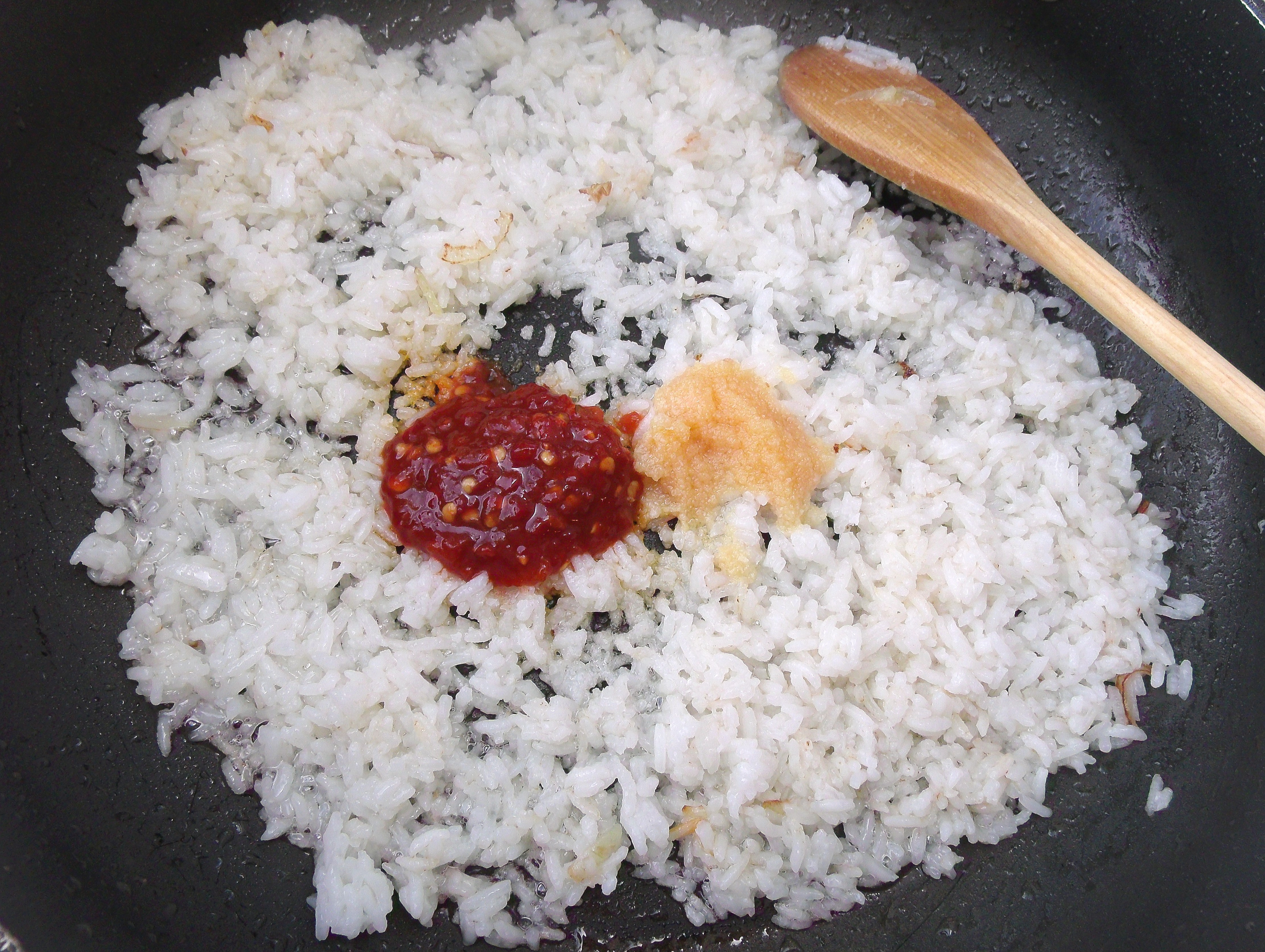 Shrimp & Egg Fried Rice ← Previous Next → stir fry 2 cup day old rice in 1 tblsp peanut oil until the rice make a popping sound, add 1/2 tsp garlic paste, 1/8 tsp ginger paste, chili paste and kosher salt to taste, mix well