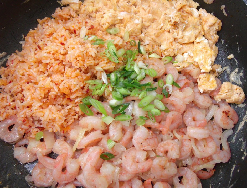 Shrimp & Egg Fried Rice ← Previous Next → return the rice, onion and shrimp to the eggs, add 1 tsp sesame oil and 2 tblsp finely sliced scallions and stir fry until heated