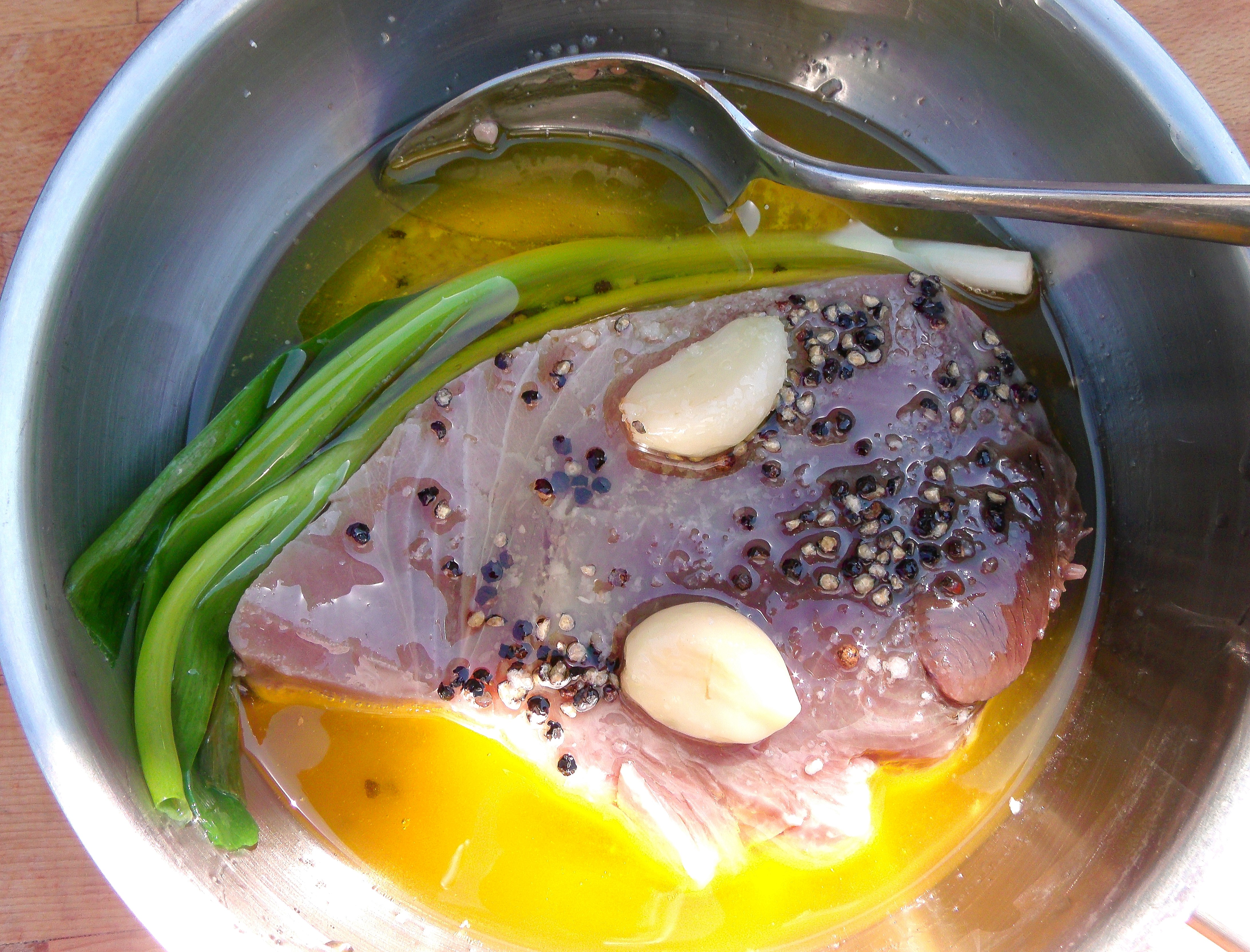 Tuna Steak Poached In Olive Oil Next → 1 cup EVO, 2 ea garlic confit, 2 ea scallion, kosher salt and fresh-cracked pepper to taste