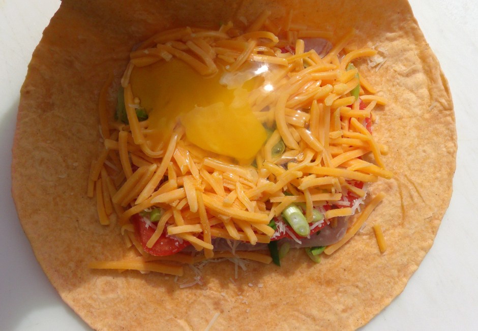 top with 1 raw egg, fold into a pouch, seams on the top; add another wrap, fold into a pouch, seams on the bottom; bake at 365f until the egg is cooked to your preferred doneness, 30 – 55 minutes (this one baked for 45 minutes, notice the egg is still moist)