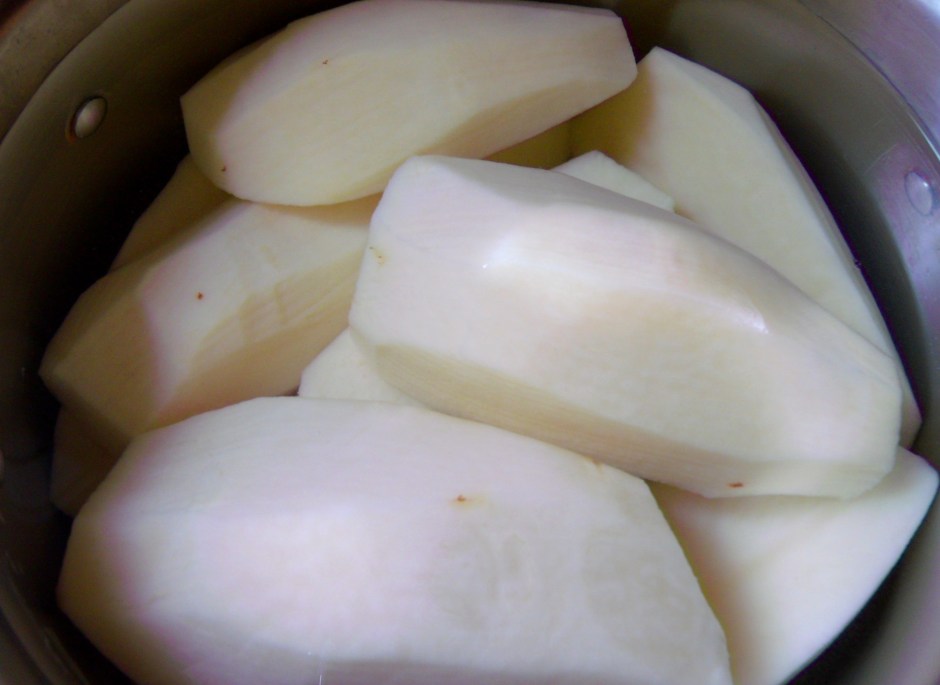 1 Next → simmer 4 ea baking potatoes, peeled and halved, in lightly salted water for 15 minutes (potatoes will not be fully cooked), drain
