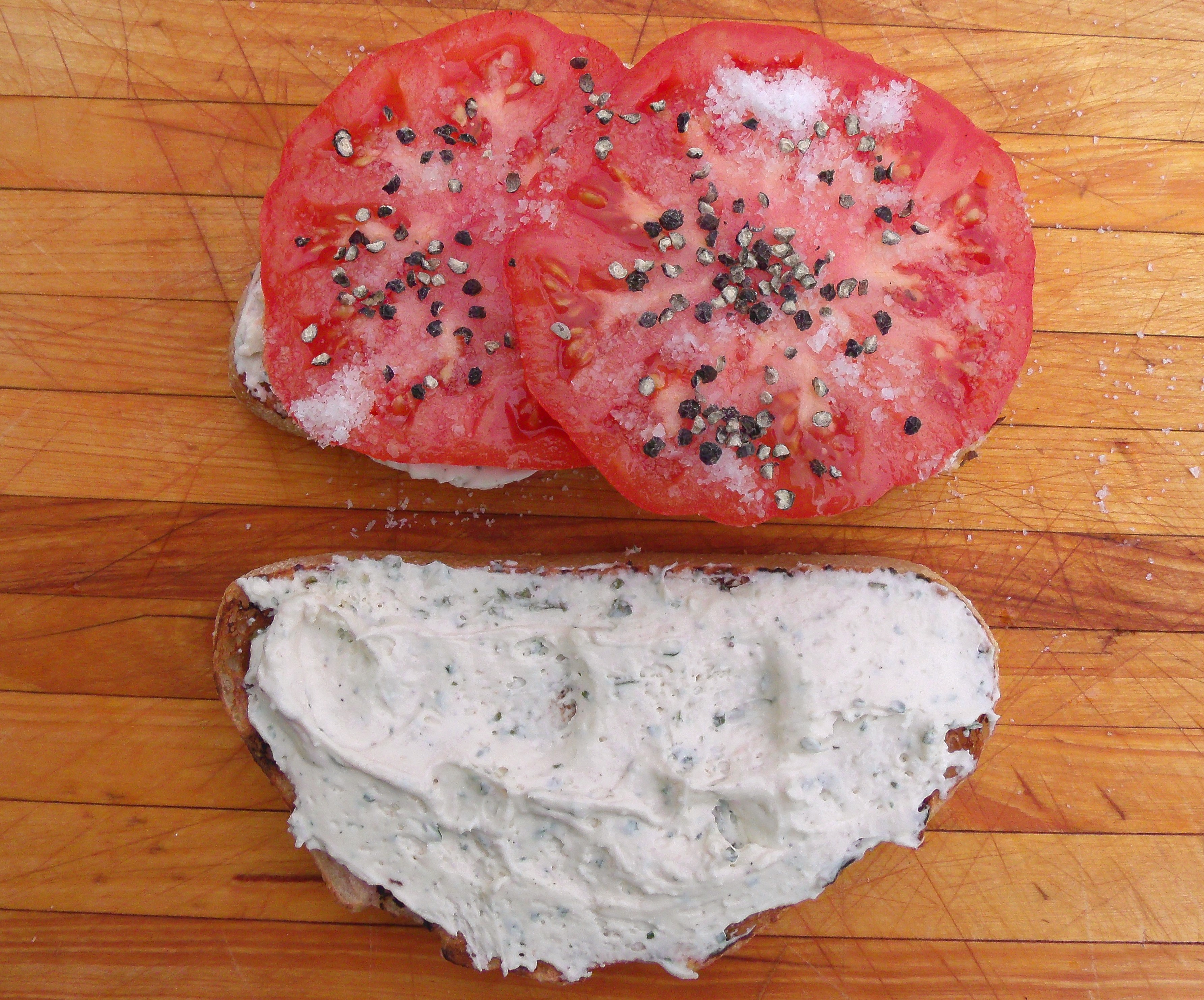 Fried Chicken&Boursin Sandwich ← Previous Next → top one slice of bread with sliced tomato, season tomato with kosher salt and fresh-ground black pepper