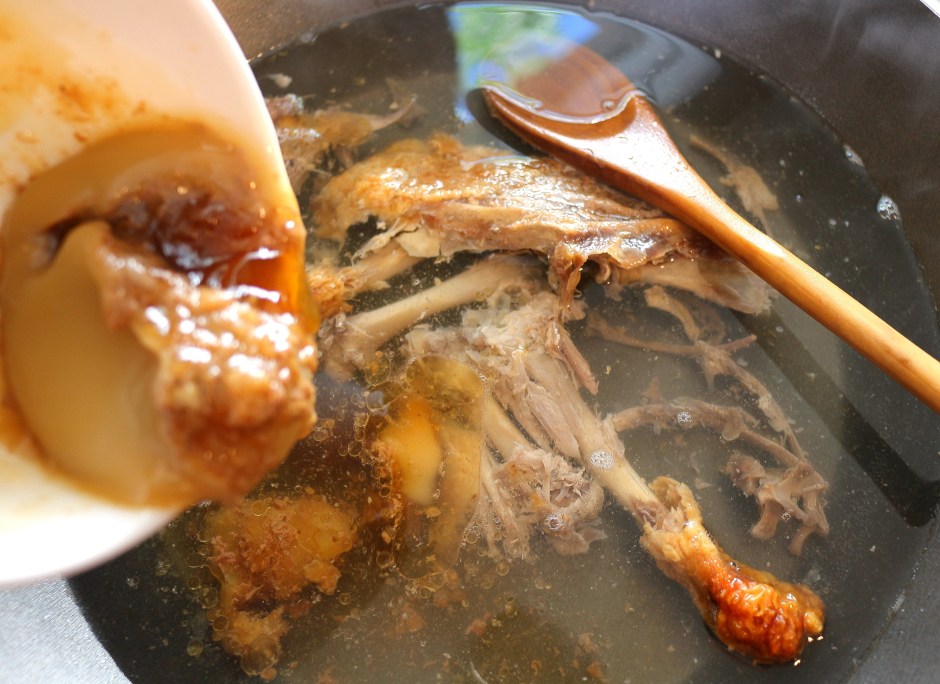 add the duck bones, the skin and scraps to 1 qt chicken or vegetable stock, add all the juices and 2 tblsp duck fat that have collected when roasting the duck(see pick next to the roasted whole duck) simmer for 30 minutes or until there is 1/2 qt stock left