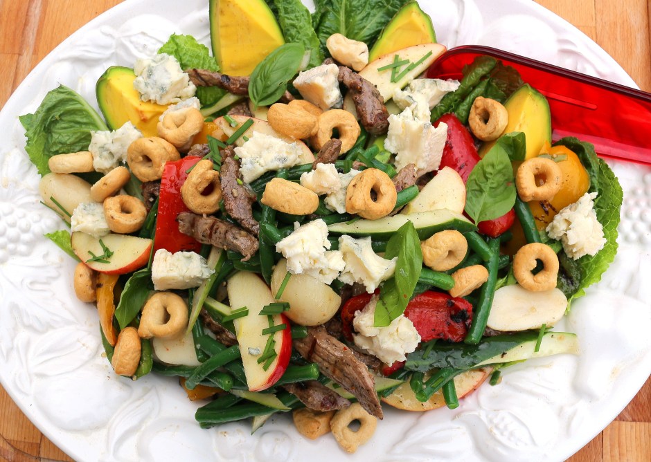 Steak Salad – Recipe # 1379 ← Previous Next → top the salad with the crumbled gorgonzola, the tarallini and the sliced chives