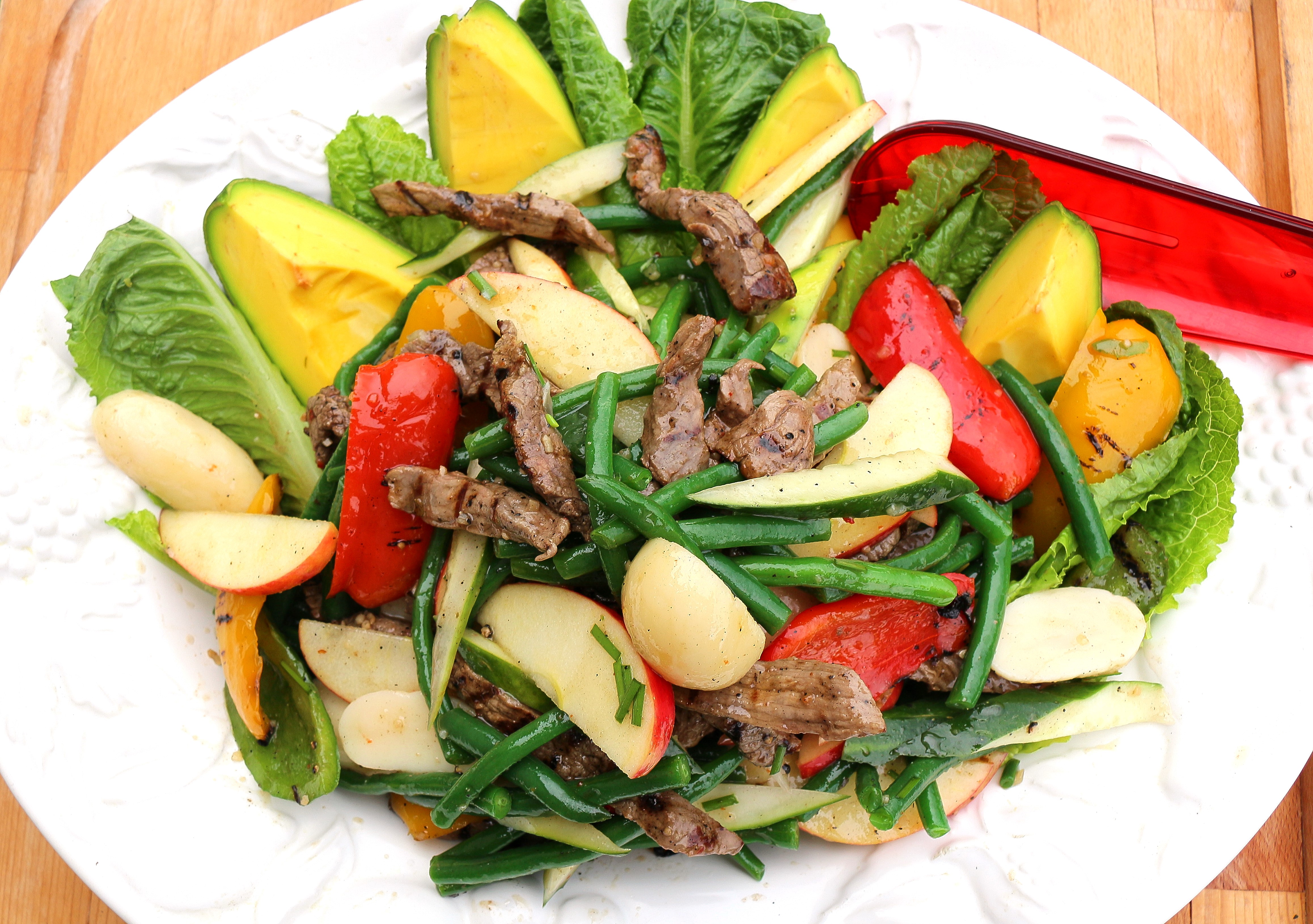 Steak Salad – Recipe # 1379 ← Previous Next → place the avocado and romaine on a serving platter, drizzle with the remaining vinaigrette, top with the salad mixture