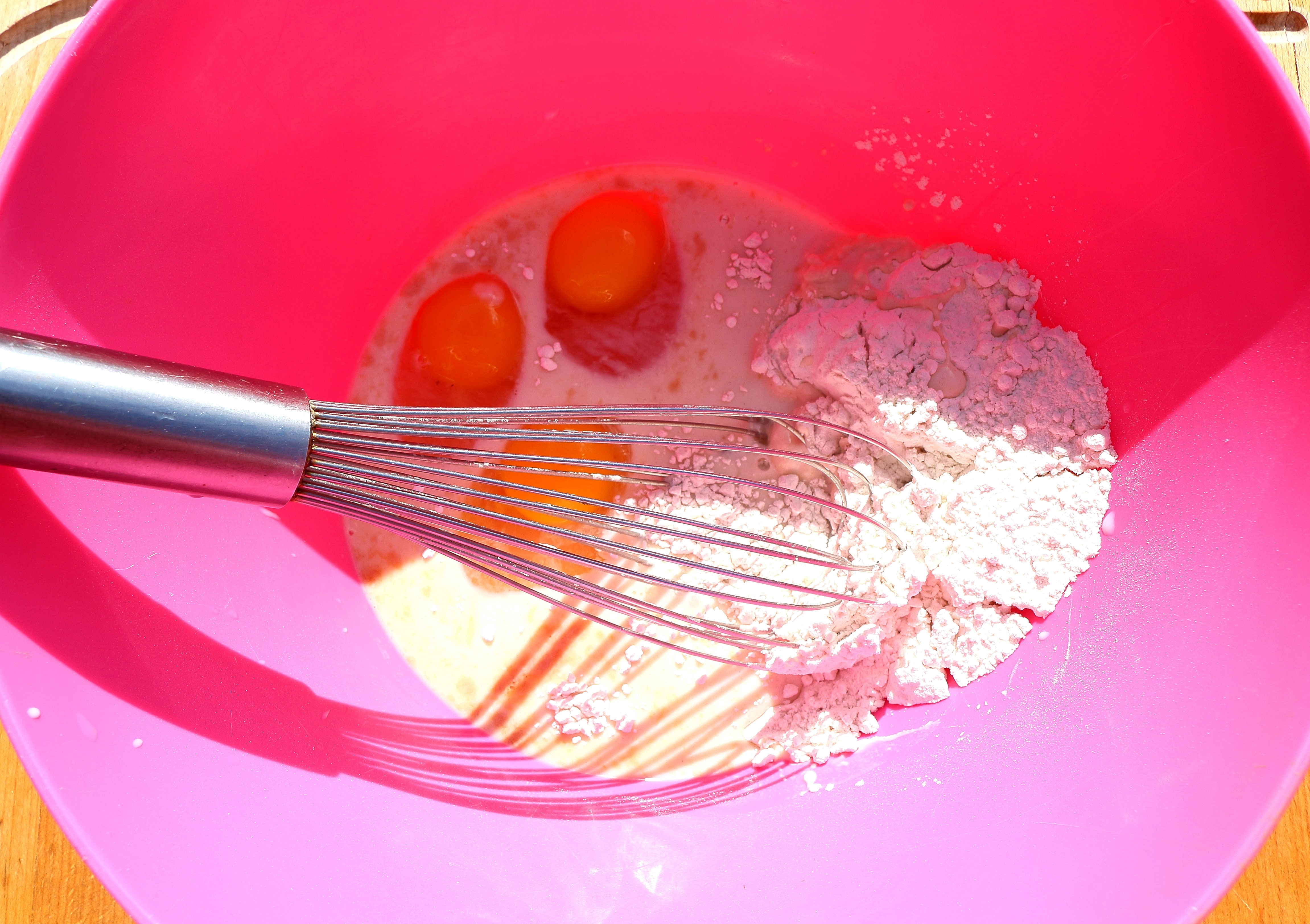 in a bowl mix togetter 1 cup a/p flour, 3 med size eggs, 1/2 cup milk, 1/2 tsp vanilla extract, 1 tblsp sugar, mix well until there are no lumps (if too thick, add a bit of milk; if too thin, add a bit of flour) this will make 5 med size crepes
