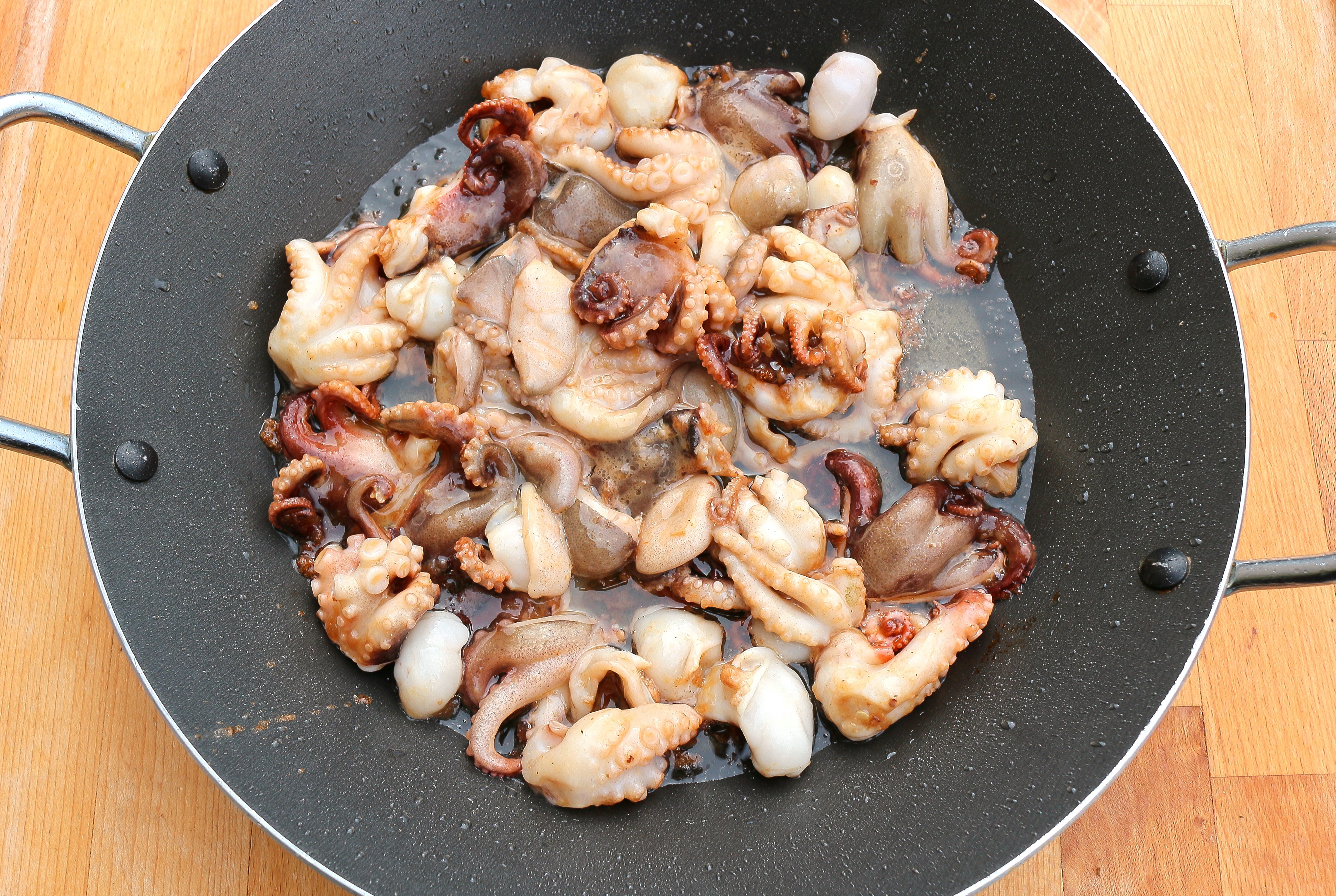 stir fry the baby octopus in 1 cup of VERY HOT peanut oil for 1 minute, remove with a slotted spoon to a thick layer of absorbent paper, discard all but 1 tblsp of the remaining peanut oil