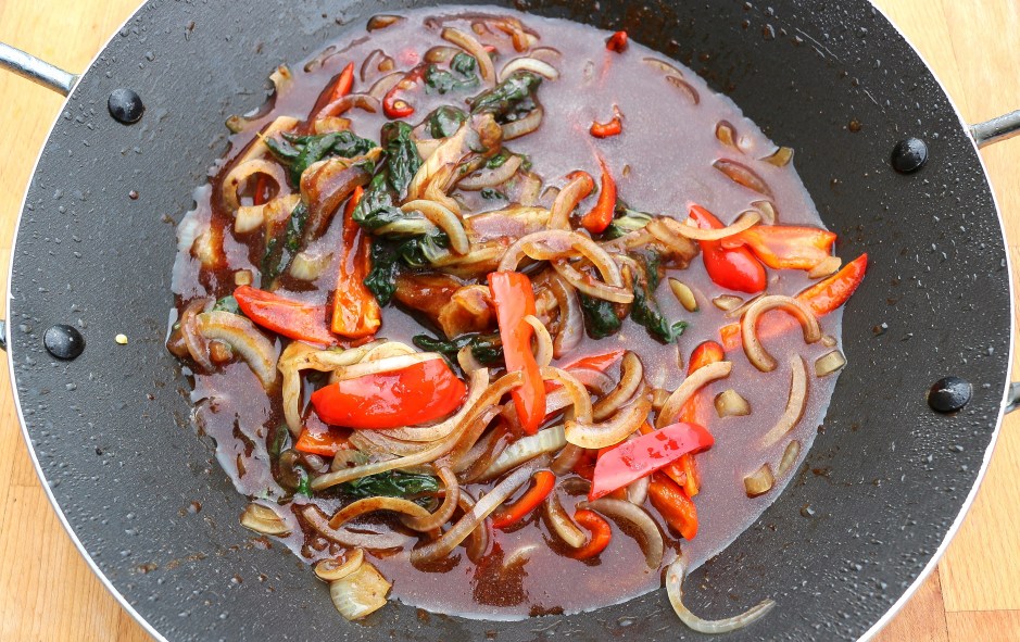 add the sauce mix, bring to a simmer, add the baby octopus, simmer for no more that 10 seconds (just to give the rice flour time to thicken but NOT to toughen the octopus), remove from heat
