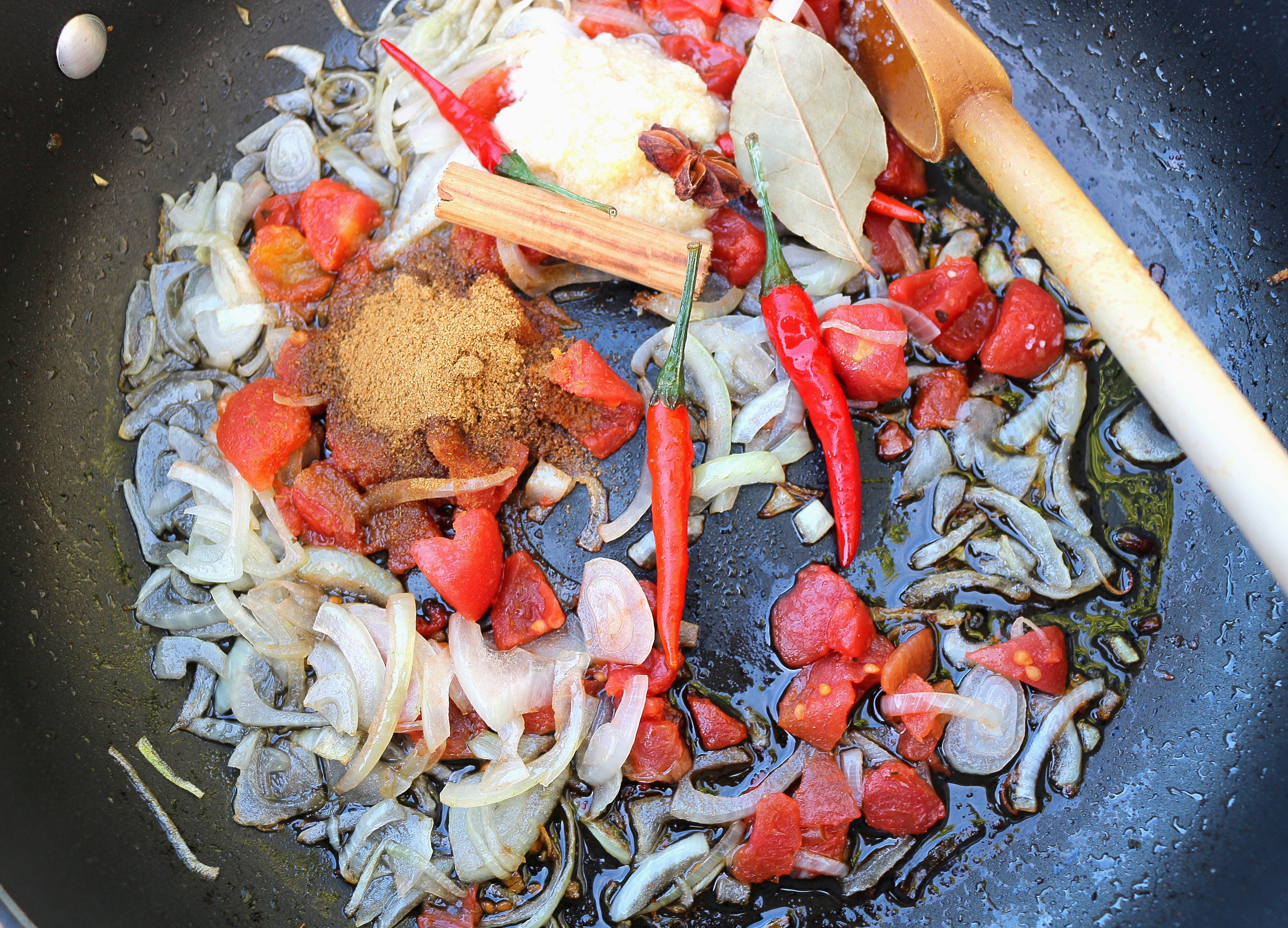 Faux Chicken Biryani ← Previous Next → add 8 oz diced tomatoes, 1/2 cinnamon stick, 3 ea chilies, 1 ea bay leaf, 1 tblsp grd cumin, 1 tblsp grd coriander, saute until fragrant
