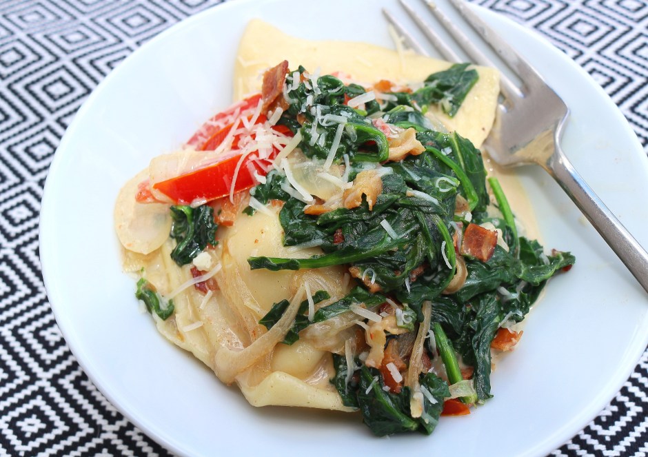 Cheese And Potato Vareniki, With Spinach, Bacon and Tomato ← Previous Next → Cheese And Potato Vareniki, With Spinach, Bacon and Tomato