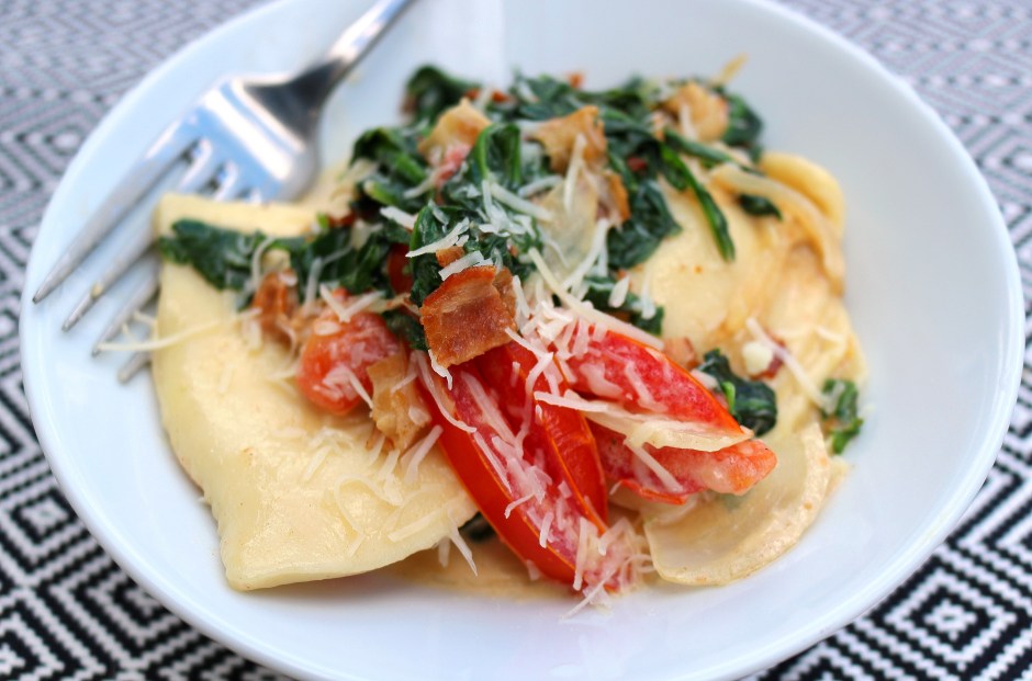 Cheese And Potato Vareniki, With Spinach, Bacon and Tomato ← Previous Cheese And Potato Vareniki, With Spinach, Bacon and Tomato
