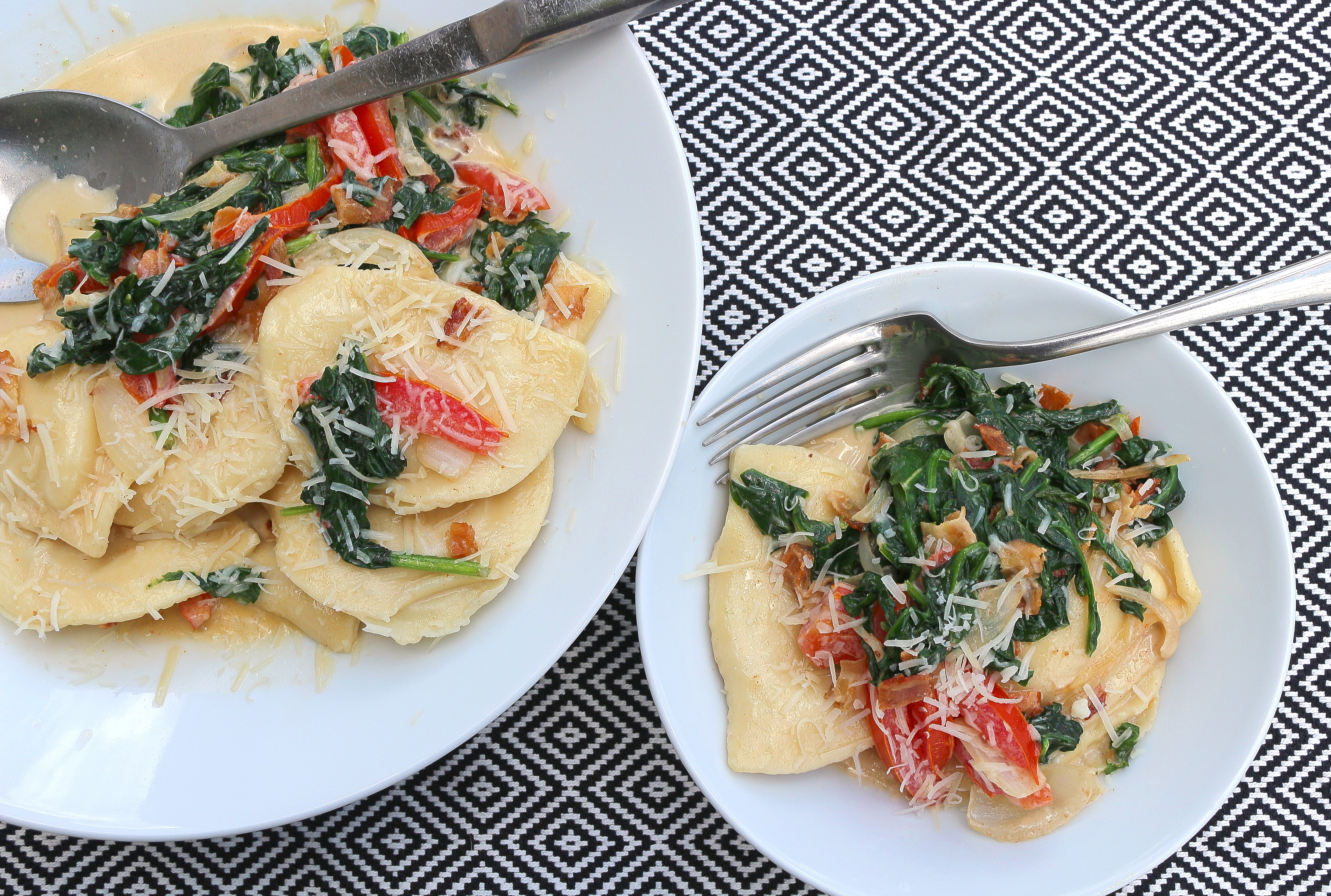 Cheese And Potato Vareniki, With Spinach, Bacon and Tomato ← Previous Next → Cheese And Potato Vareniki, With Spinach, Bacon and Tomato