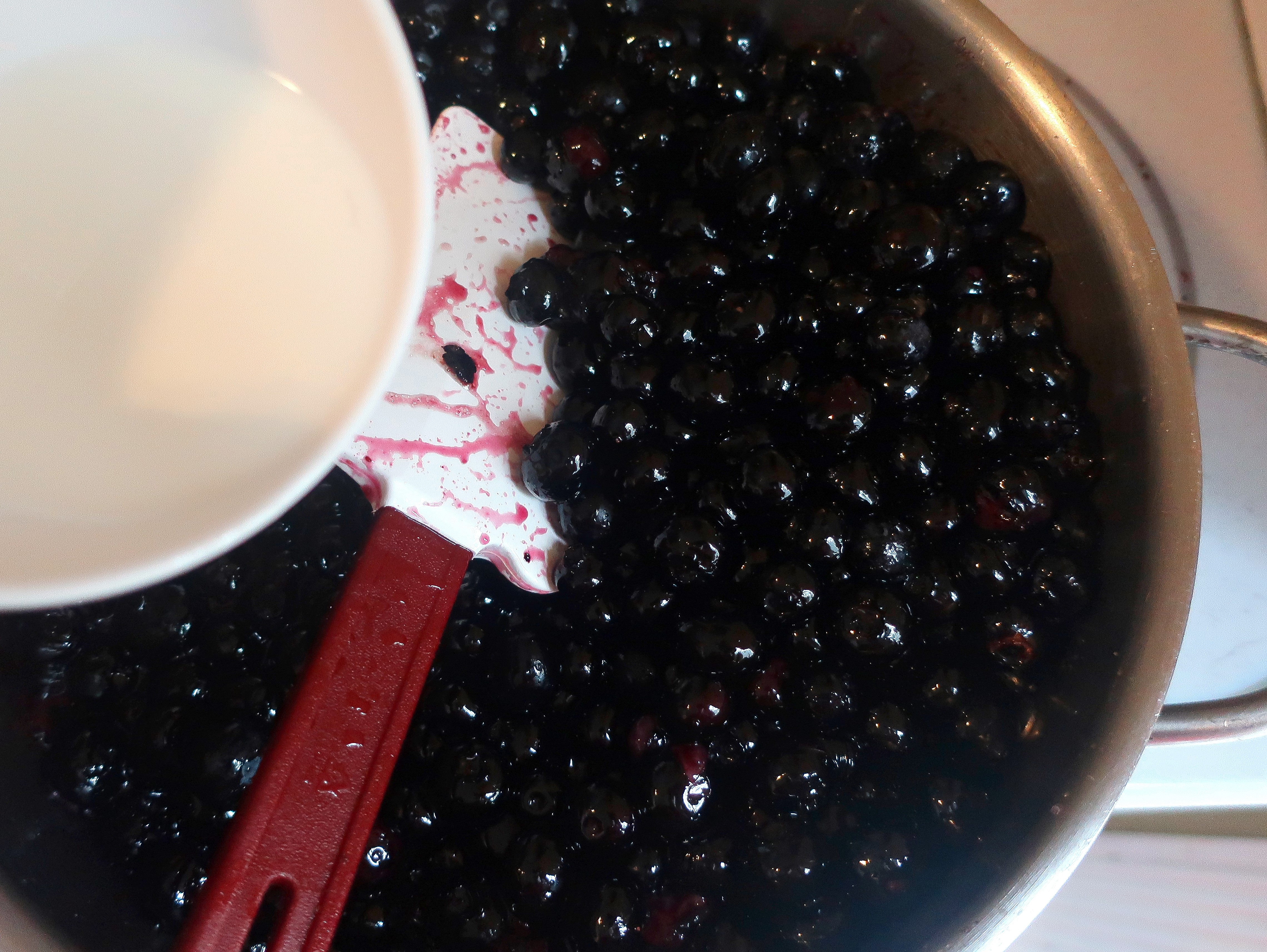 Easy Does It # 34 – Angel Cake With Vanilla C And Blueberry Compote ← Previous Next → melt 4 oz of butter, add 4 cups of washed and dried, fresh blueberries, when simmering, add 1 tblsp corn starch slurry, simmer a few more seconds, remove from heat