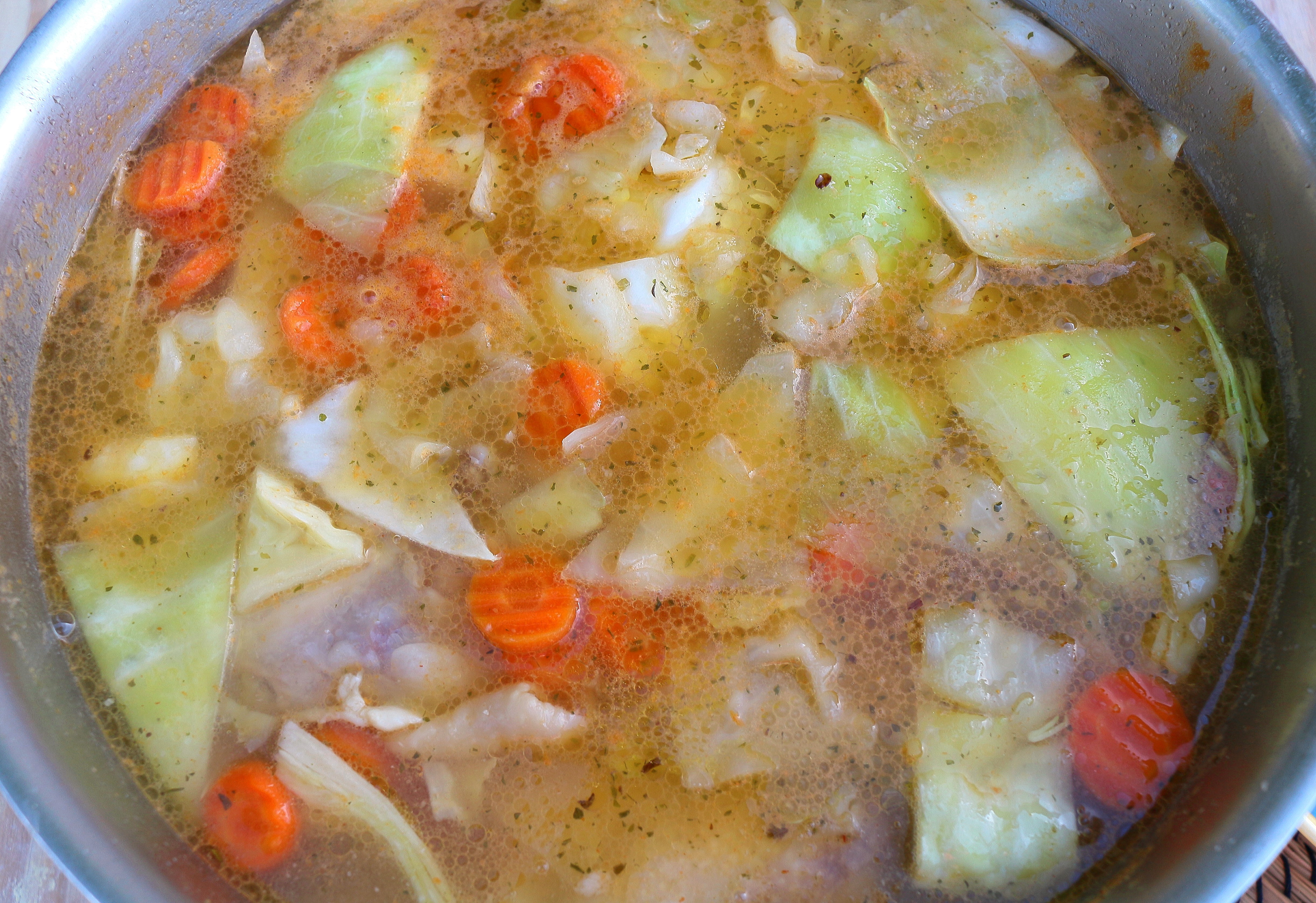 4 ← Previous Next → cut 1 medium sixe white cabbage and 8 ea med size carrots into bite size pieces, add to the soup together with 1 tblsp garlic paste and 1/2 tsp dry oregano, simmer until carrots are tender, check/adjust seasoning