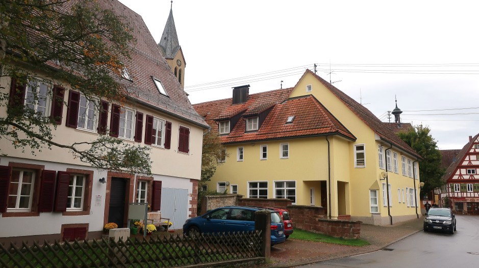 the former priest’s home (Pfarrhaus) on the left, my old school on the right
