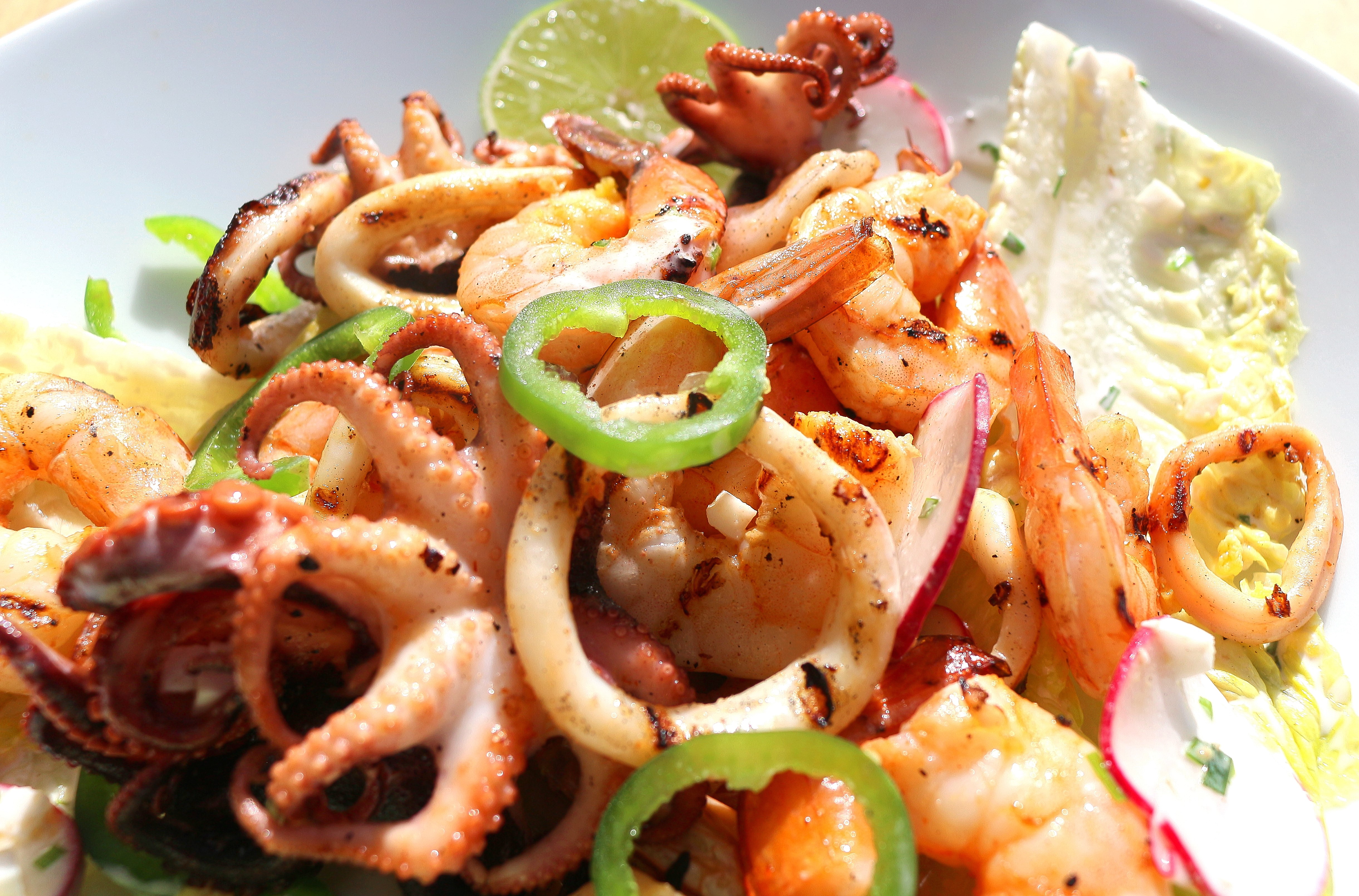 Grilled Seafood Salad – Baby Octopus, Squid And Shrimp On Romaine In Honey/Lime Yogurt Dressing ← Previous Next → Grilled Seafood Salad – Baby Octopus, Squid And Shrimp On Romaine In Honey/Lime Yogurt Dressing