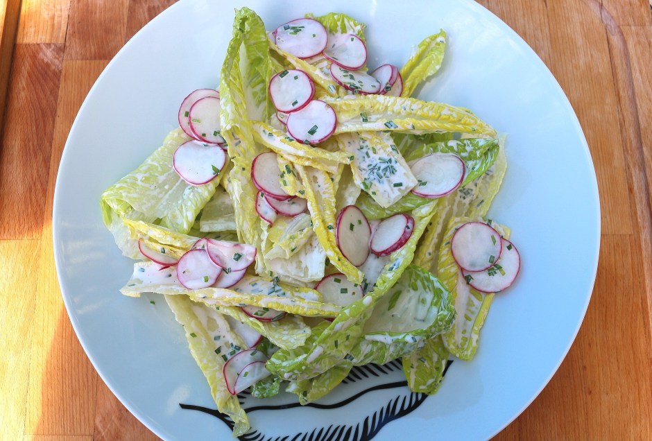 mix 1/4 cup greek yogurt with 1 tblsp lime juice, 1 tblsp sliced chives and 1 tblsp organic honey, season with kosher salt and cayenne pepper to taste, toss with the salad, arrange on a serving platter