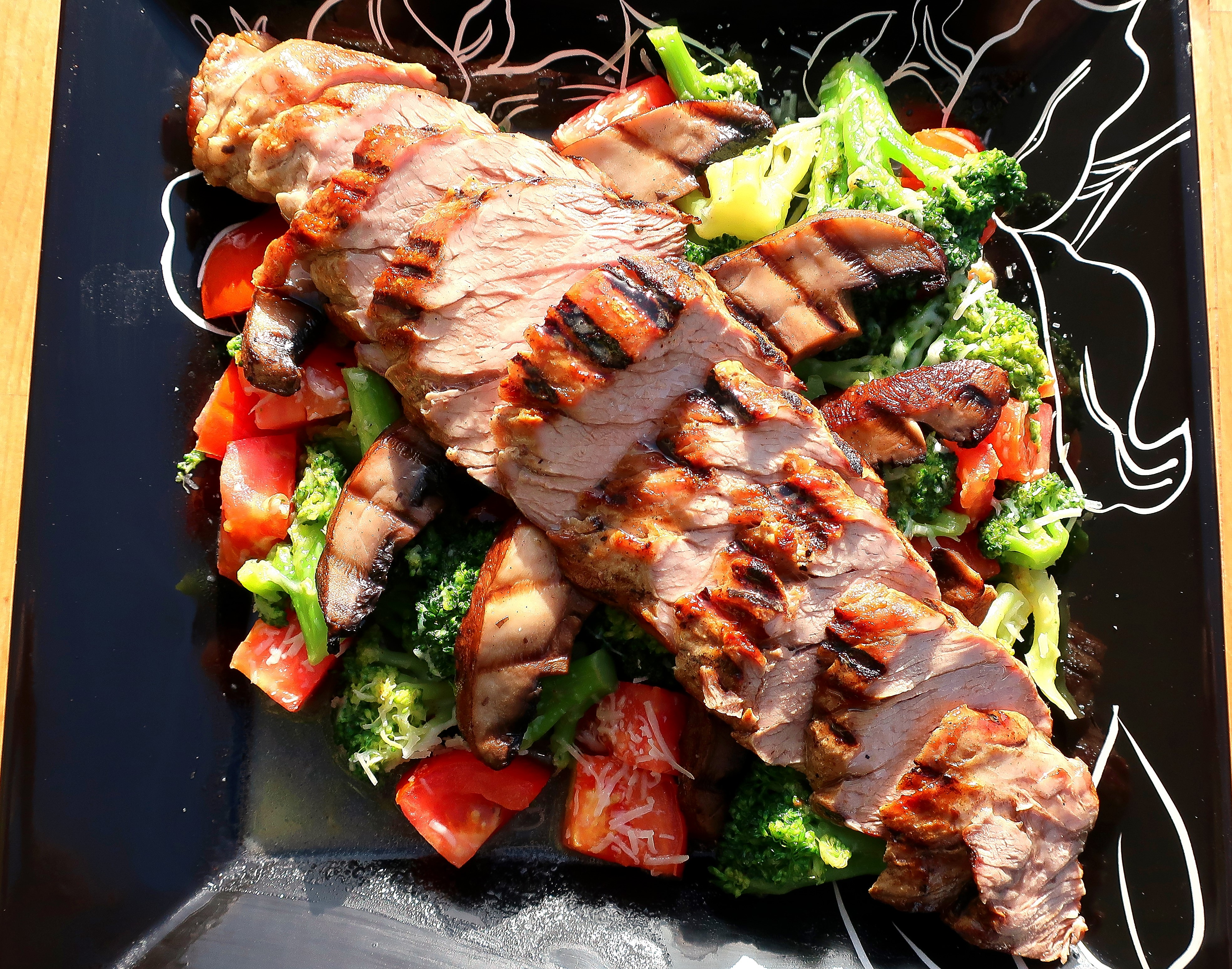 Grilled Pork Tenderloin With Portobello, Broccoli And Tomato ← Previous Next → arrange the fillet on top of the vegetables, sprinkle with fresh-grated asiago cheese and sliced scallions; serves 2