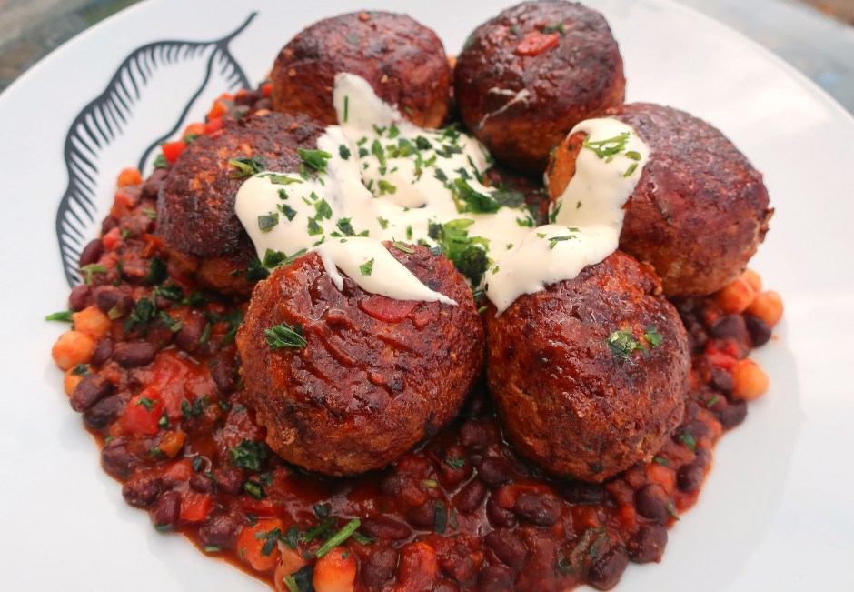 Rice Bowl With Spicy Meatballs, Black Beans & Garbanzo Stew
