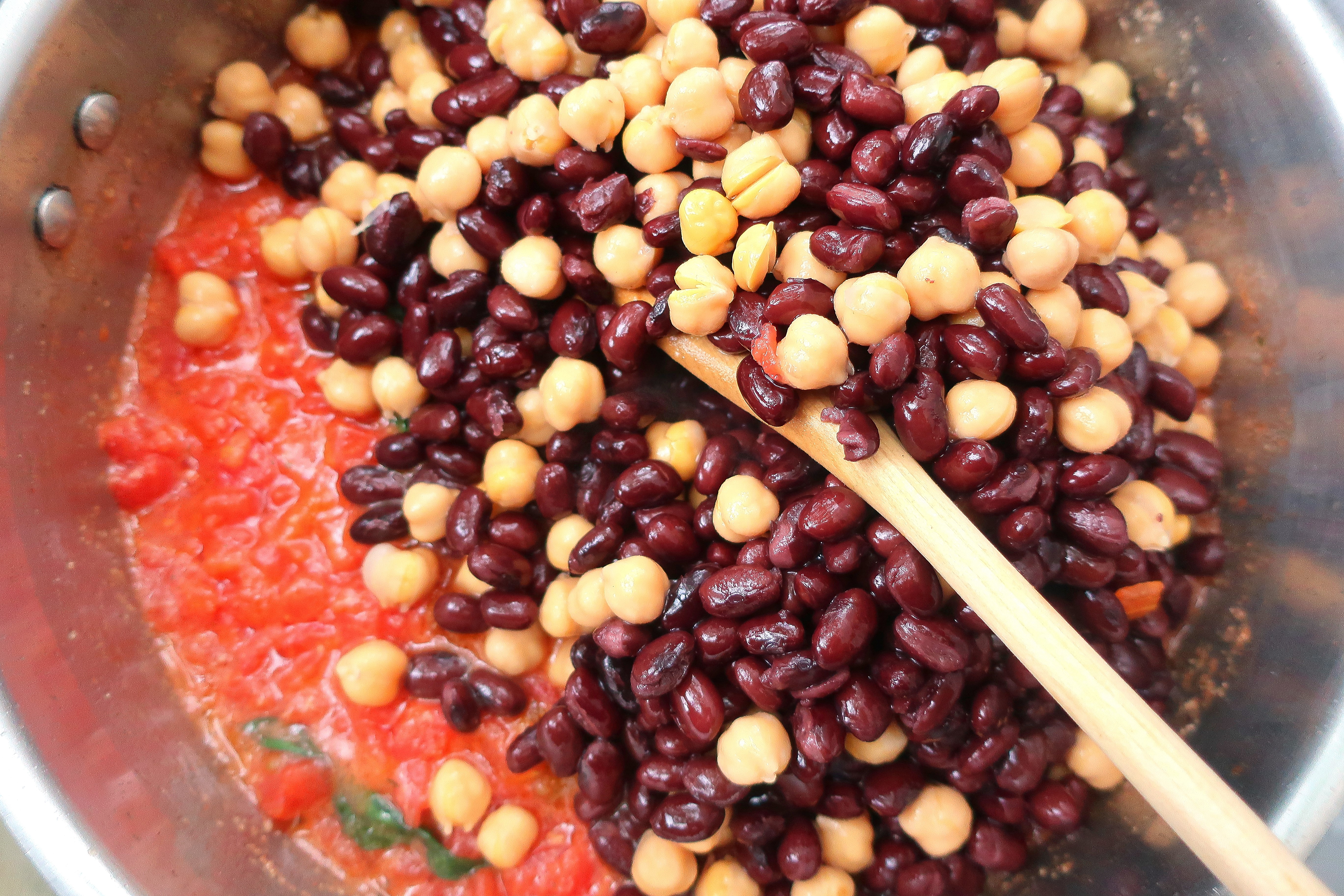 add 1 ea 10 0z can of drained garbanzos and 1 ea 10 0z can of drained black beans, 1 cup of chicken-, beef- or veggie-stock, season with cumin, oregano, cayenne pepper and kosher salt to taste