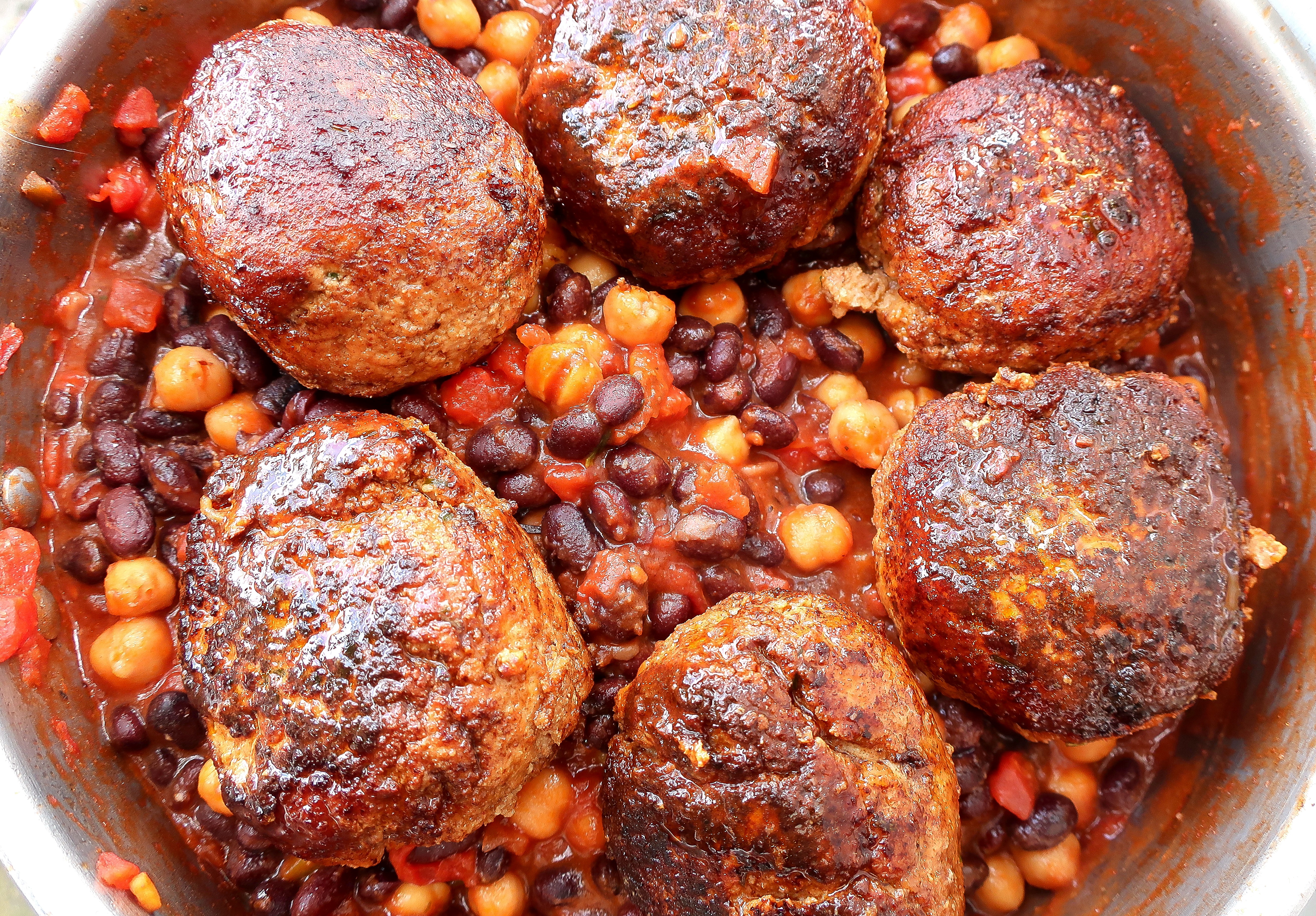 Rice Bowl With Spicy Meatballs, Black Beans & Garbanzo Stew ← Previous Next → add the meatballs, cover, simmer VERY slowly until cooked through, but NOT dry !!!