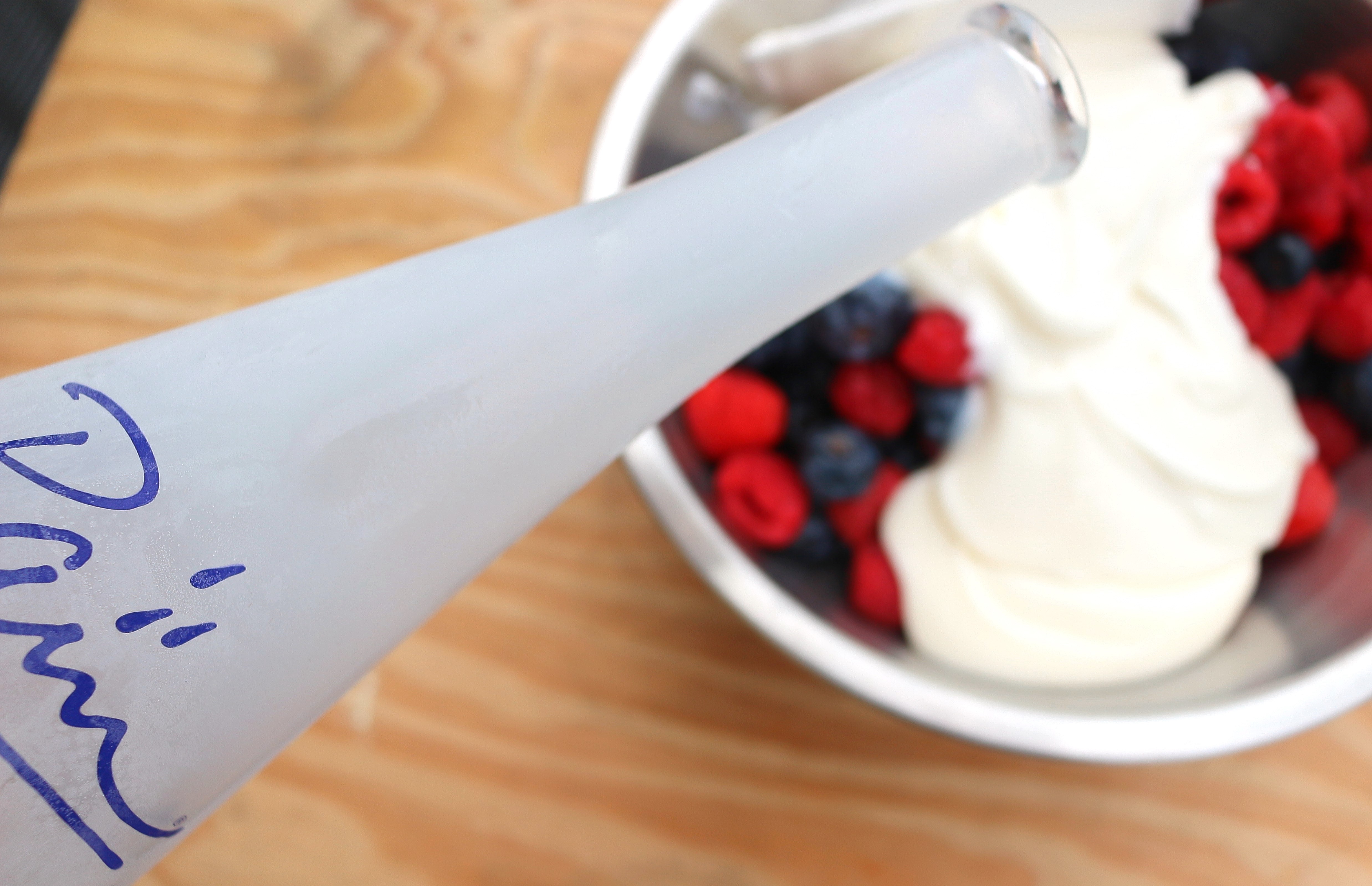 add 1/2 cup Greek yogurt, 2 tblsp organic honey and 1/2 jigger vodka