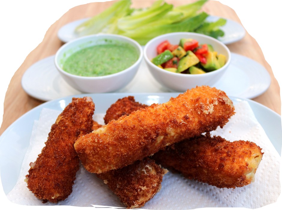 Fried Camembert With Avocado Salad, Salsa Verde, And Crisp Romaine Leaves ← Previous Next → Fried Camembert With Avocado Salad, Salsa Verde, And Crisp Romaine Leaves