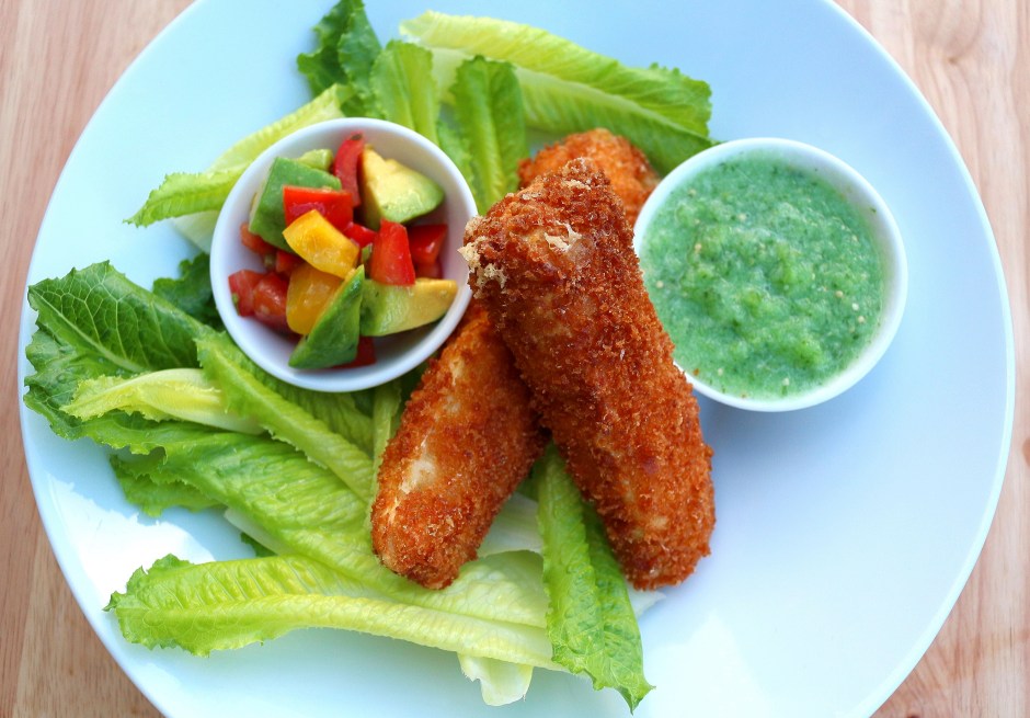 Fried Camembert With Avocado Salad, Salsa Verde, And Crisp Romaine Leaves ← Previous Next → Fried Camembert With Avocado Salad, Salsa Verde, And Crisp Romaine Leaves