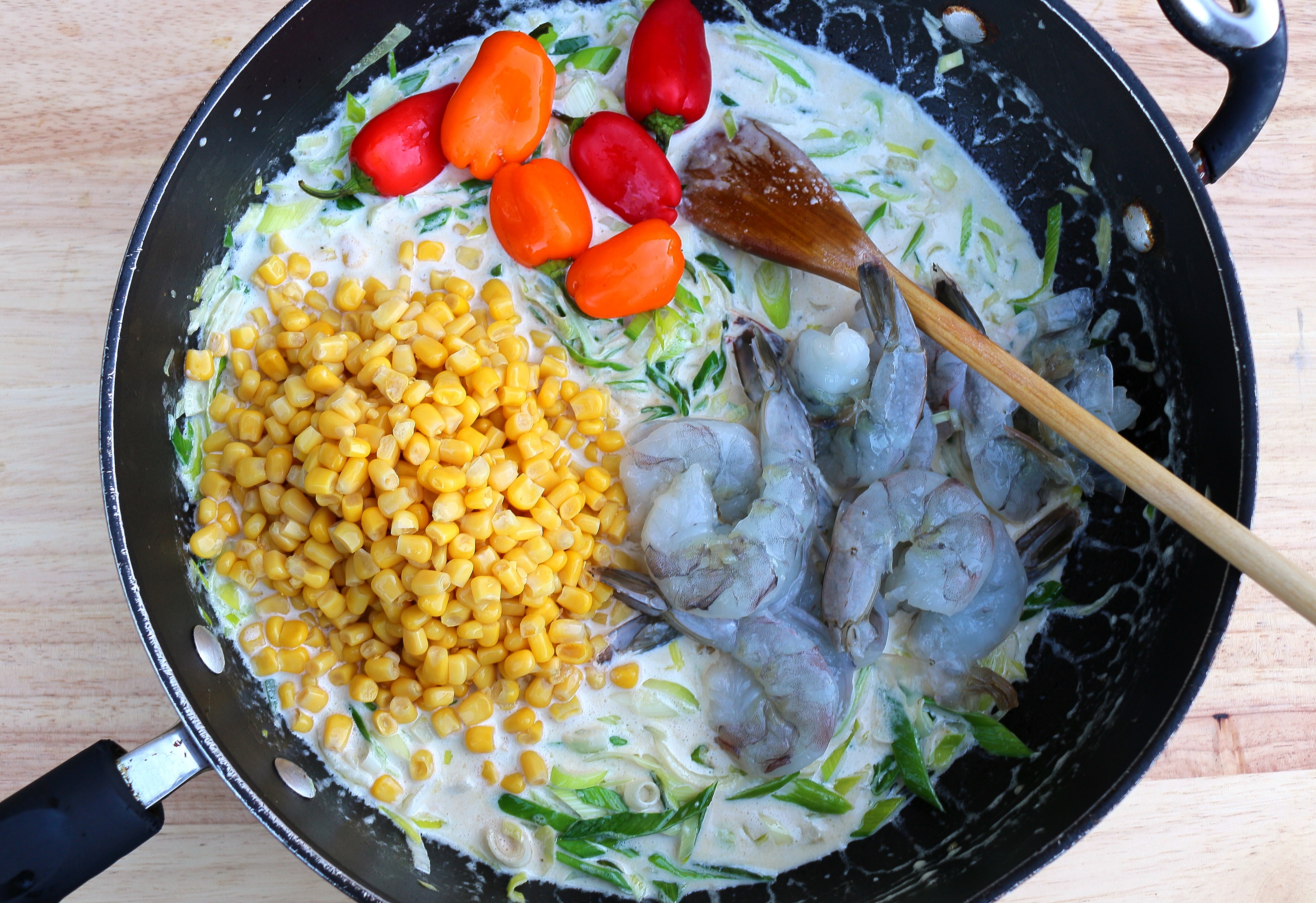 add 1 cup kernel corn, 6 ea small chillies and 1 lb of large shrimp, season with kosher salt and pepper to taste, stir, cover, simmer slowly until shrimp are just cooked through (2 to 4 minutes, depending on the size of the shrimp), check/adjust the seasoning