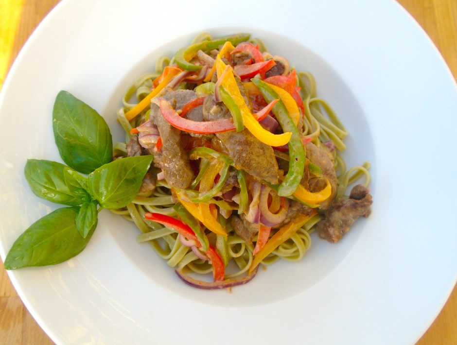 Spinach Linguini With Beef And Peppers In Garlic Cream ← Previous Next → Spinach Linguini With Beef And Peppers In Garlic Cream