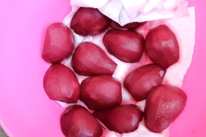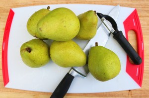 - when cool, remove the pears and pat dry, cut off the top and buttom, then around the core into 4 pieces, discard the top, bottom and core, cut the pears into 1 inch dice