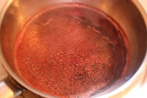 You add the fully cooked fruit later so they don’t sink to the bottom but stay in the middle.