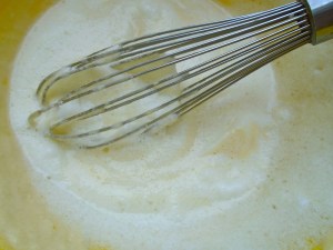 - whisk 3 egg whites until stiff peaks, fold into batter