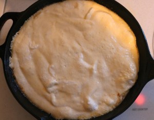 - insert a toothpick into the pancake and remove – if nothing sticks to the toothpick, the pancake is done; remove from oven, place a serving plate upside down on top of the pan, turn pan and plate upside down so the pancake sits on plate