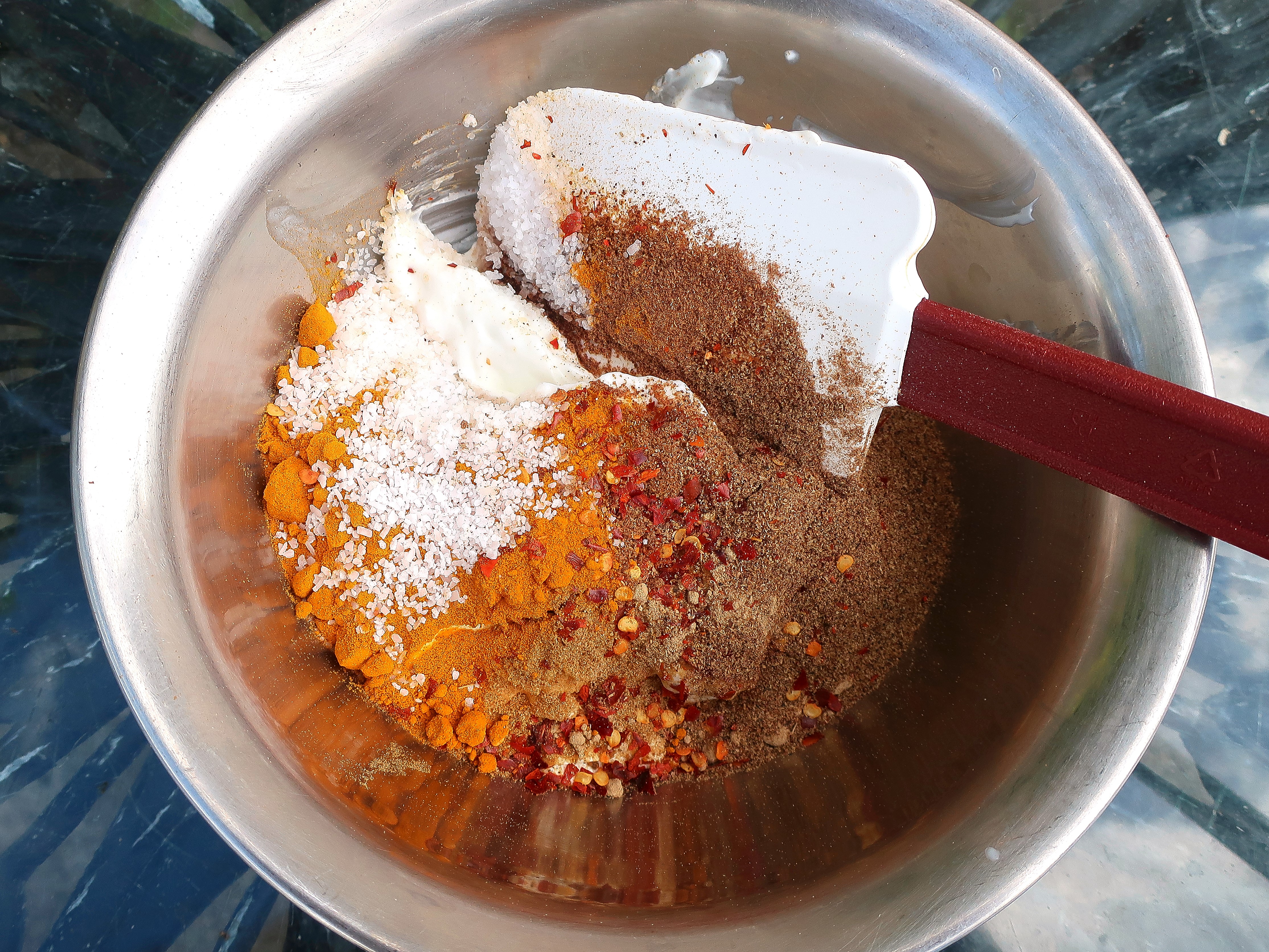mix 1 cup Greek yogurt (or strain your own yogurt overnight in a suspended cheesecloth)) with 1 tblsp garam masala, 1 tblsp turmeric, 1 tblsp sweet paprika (instead of the usual artificial food coloring), 1/2 tsp granulated garlic, 1/3 tsp granulated ginger, 1 tsp ground coriander, 1 tsp ground cumin, chili flakes and kosher salt to taste