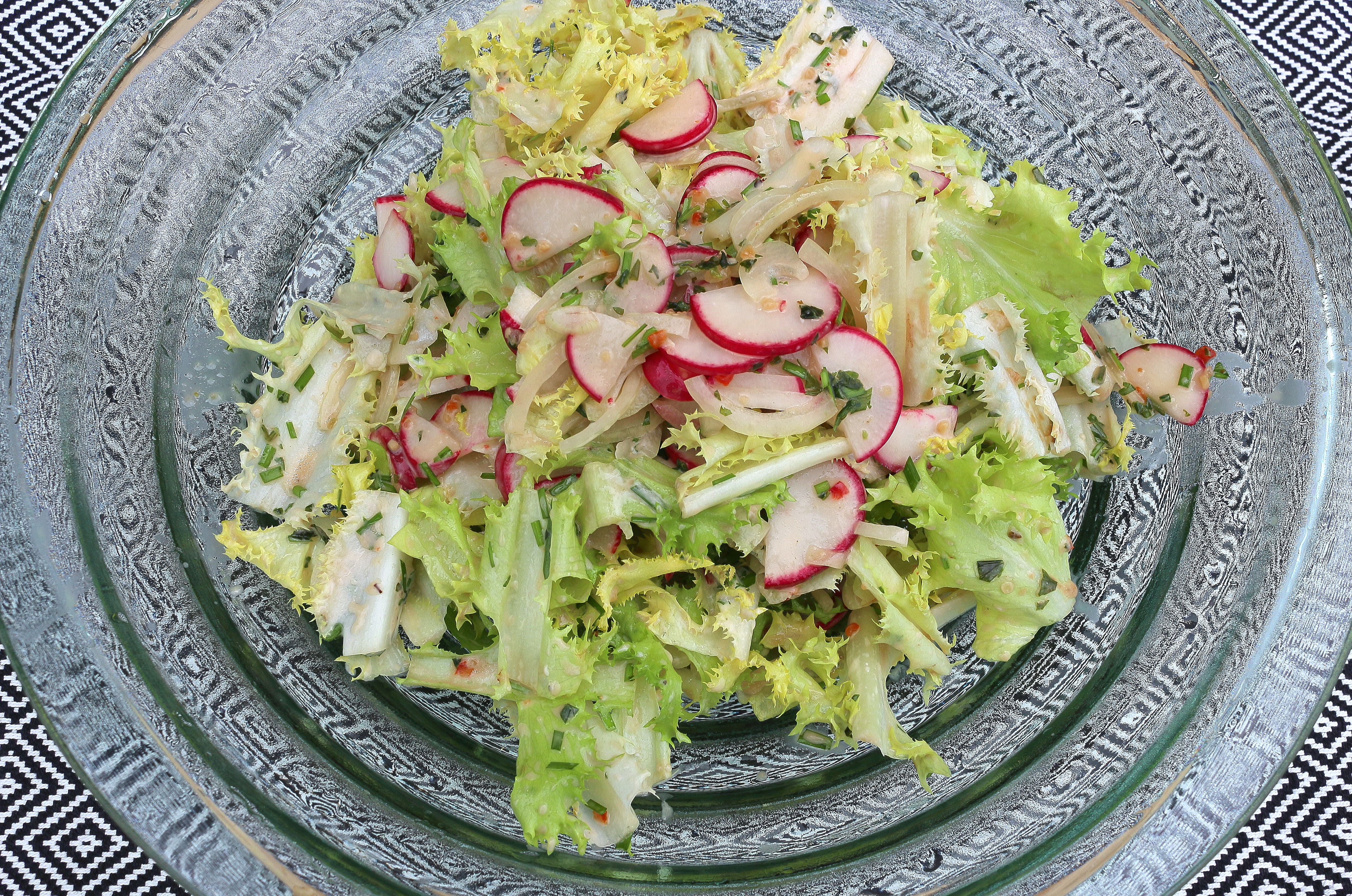 Salad Of Endive & Chili Chicken ← Previous Next → mix the salad with 1/3 cup honey/mustard dressing, plate on a large serving dish, pull (or cut if you prefer) into bite-size pieces, place on top of the salad, garnish with fresh basil