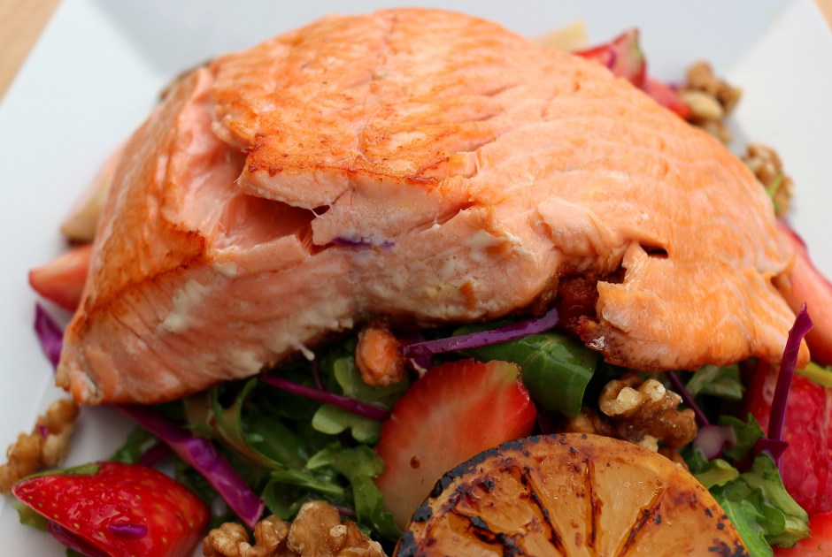 Sauteed Salmon With Arugula, Strawberries And Walnuts In Raspberry Vinaigrette ← Previous Next → Sautéed Salmon With Arugula, Strawberries And Walnuts In Raspberry Vinaigrette