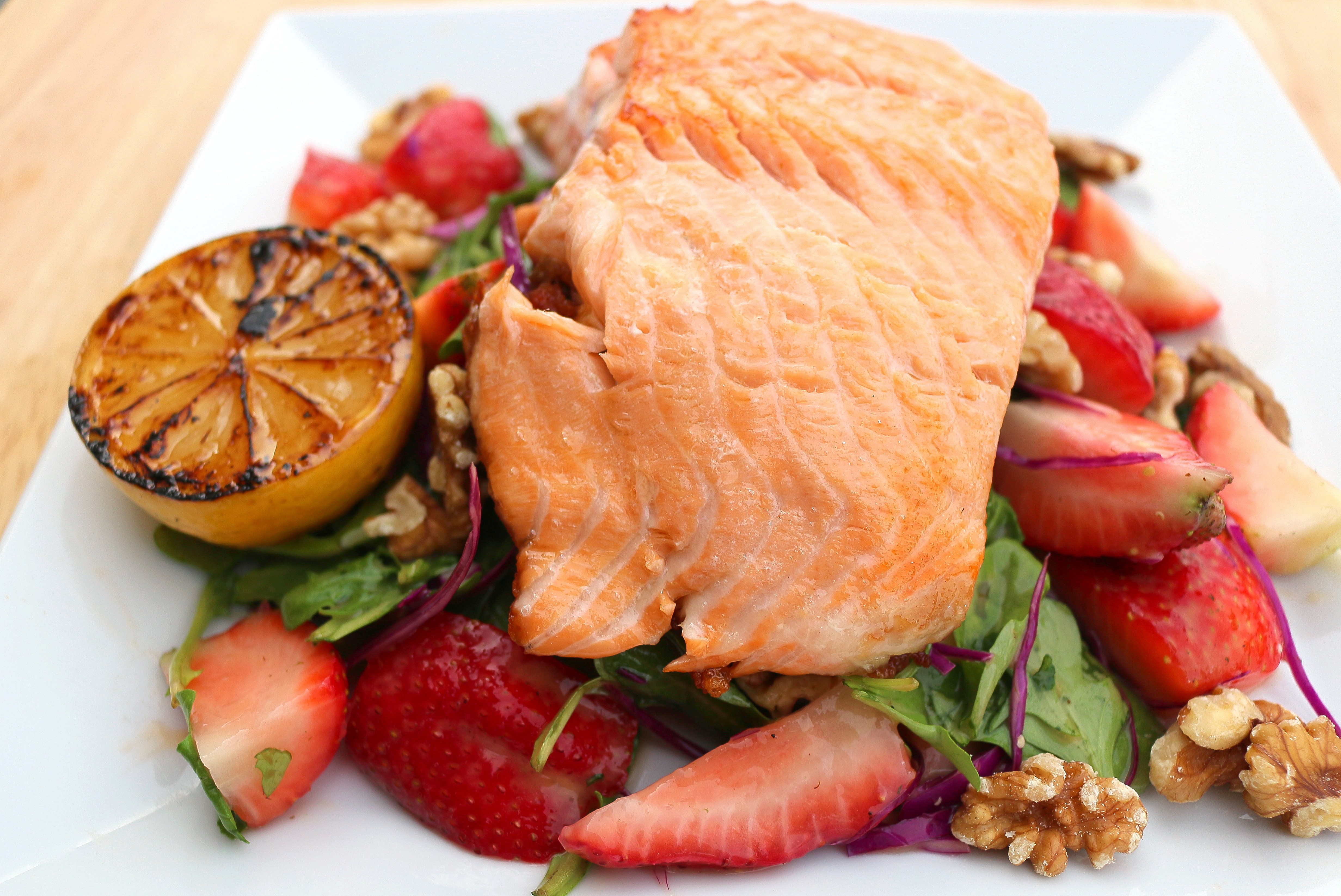 Sauteed Salmon With Arugula, Strawberries And Walnuts In Raspberry Vinaigrette ← Previous Next → Sautéed Salmon With Arugula, Strawberries And Walnuts In Raspberry Vinaigrette
