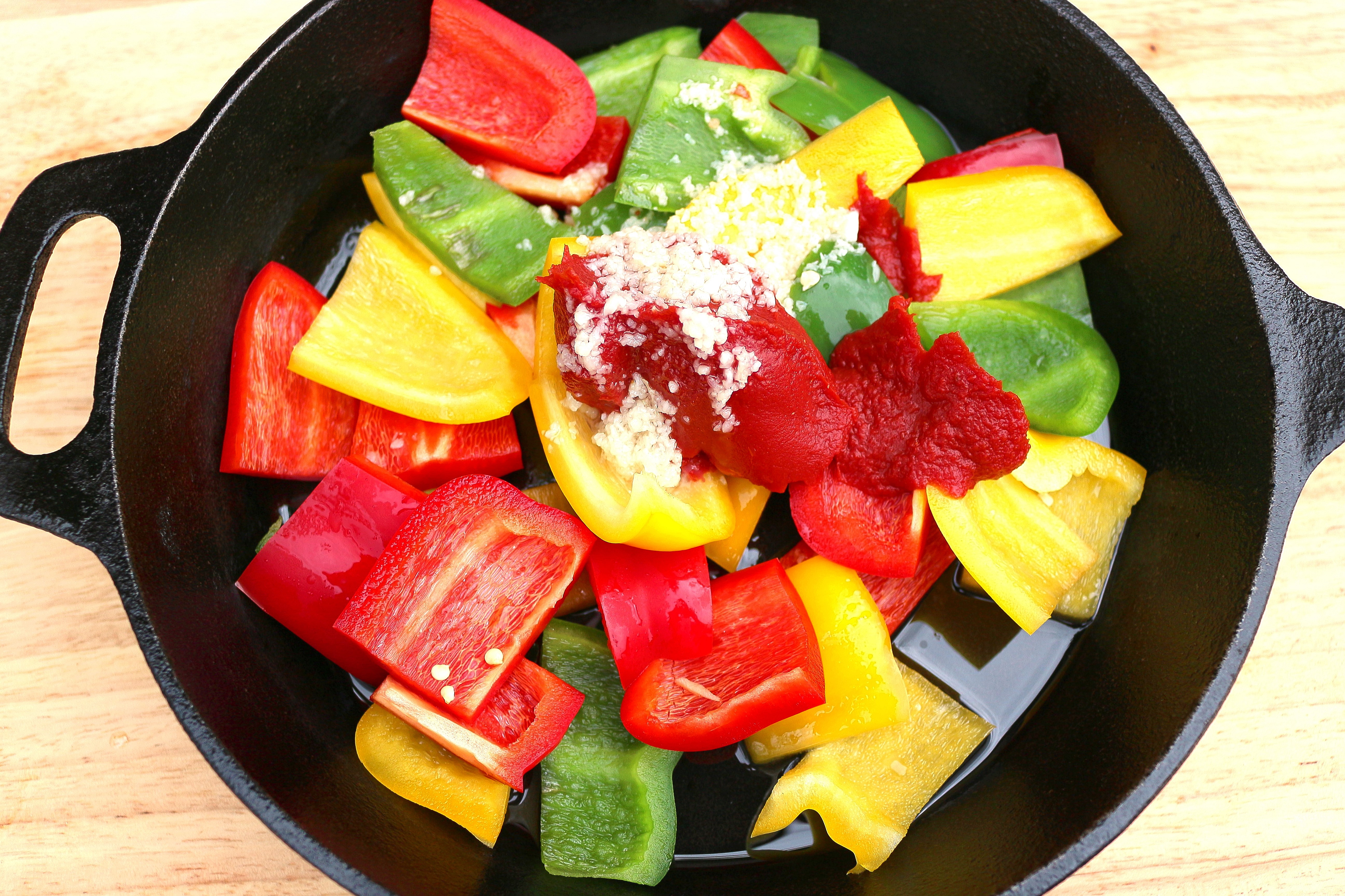 cut 1 ea yellow/green and red peppers into 1″ pieces, add to 1 tblsp olive oil in a medium hot pan, add 1 tblsp tomato paste, 1 tsp garlic paste, 1 tsp dry oregano,and kosher salt and cayenne pepper to taste
