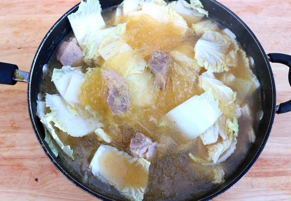 Chinese New Year Egg Dumpling Soup ( 蛋饺 ) ( Dan Jiao ) ← Previous Next → add 10 oz of nappa cabbage and 1 tblsp toasted sesame oil, stir, simmer for another minute or until the rice sticks have the proper texture, check/adjust seasoning