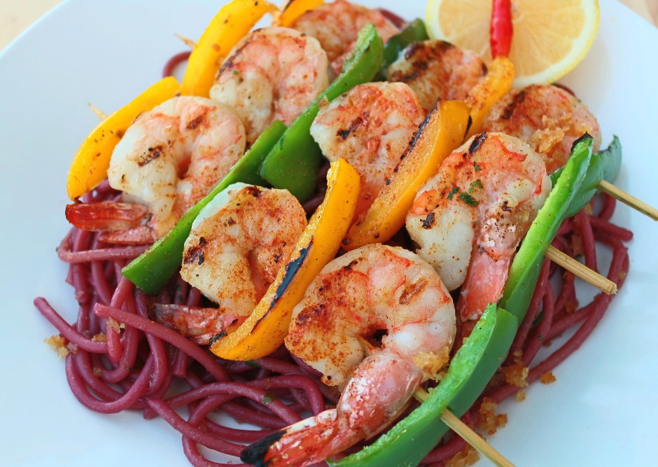 Grilled Shrimp And Peppers Brochette With Red Wine Bucatini And Pangrattato ← Previous Next → Grilled Shrimp And Peppers-Brochette With Red Wine-Bucatini And Pangrattato
