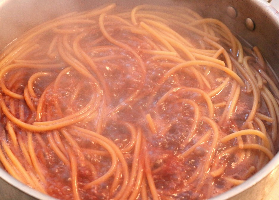 immediatly add the freshly-cooked bucatini to the simmering red wine, season lightly with kosher salt, cayenne pepper and garlic paste, simmer until al dente (at this point, there should be about 1/2 cup wine remaining; adjust if neccessary), check/adjust seasoning