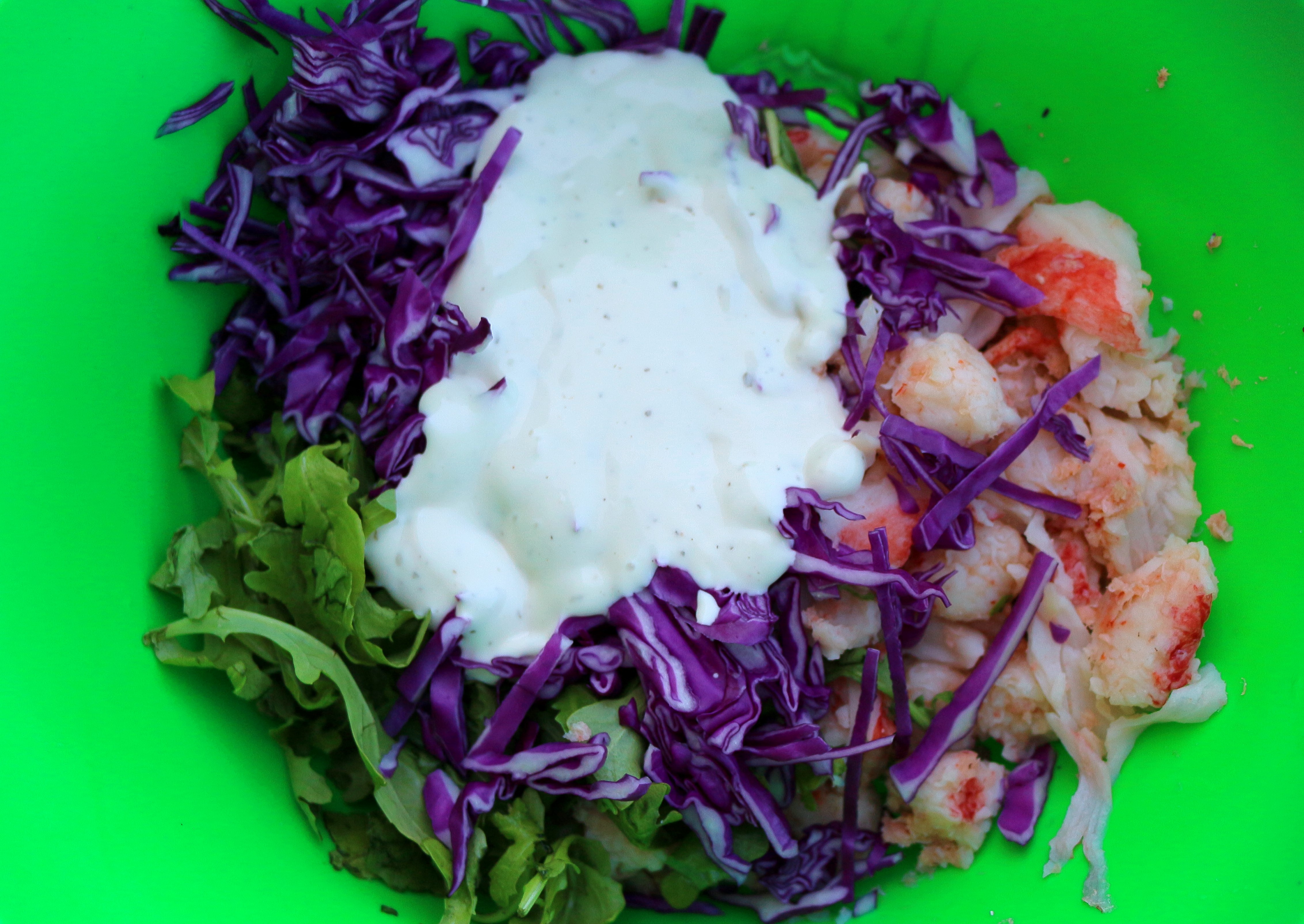 Arugula & Crab Salad In Honey-Mustard Dressing ← Previous Next → add finely sliced red cabbage and Greek yogurt dressing, mix, serve with toasted bread and sliced carambola