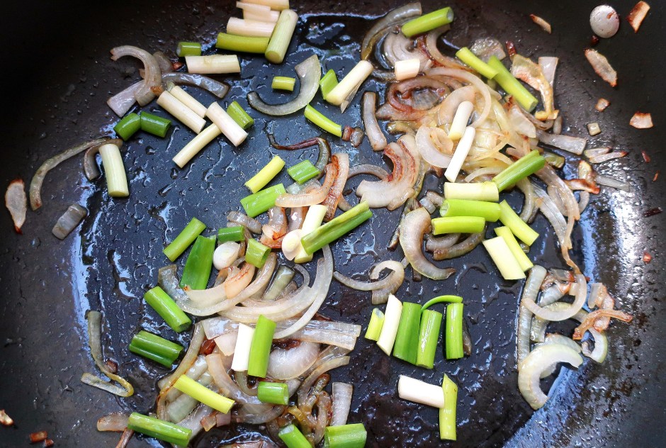 Sauteed Bone-In Ham Steak With Onion And Tomato Next → in 1 tblsp olive oil, saute 6 ea stalks of scallion, cut into 1/2 inch pieces, and 1 medium sixe onion, cut into julienne, until onions are lightly caramelized, turn down the heat of the pan to low