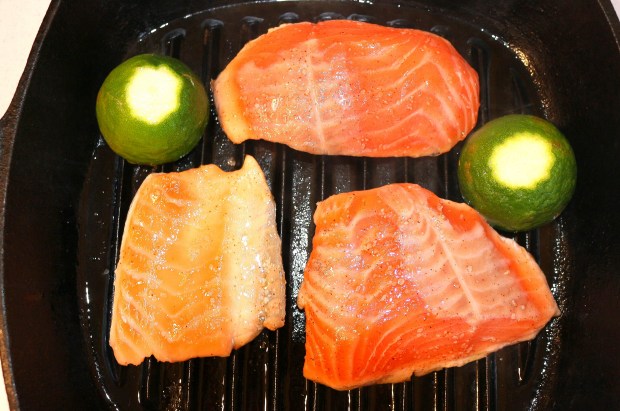season salmon fillets with kosher salt, cayenne pepper and lime juice to taste, brush with olive oil