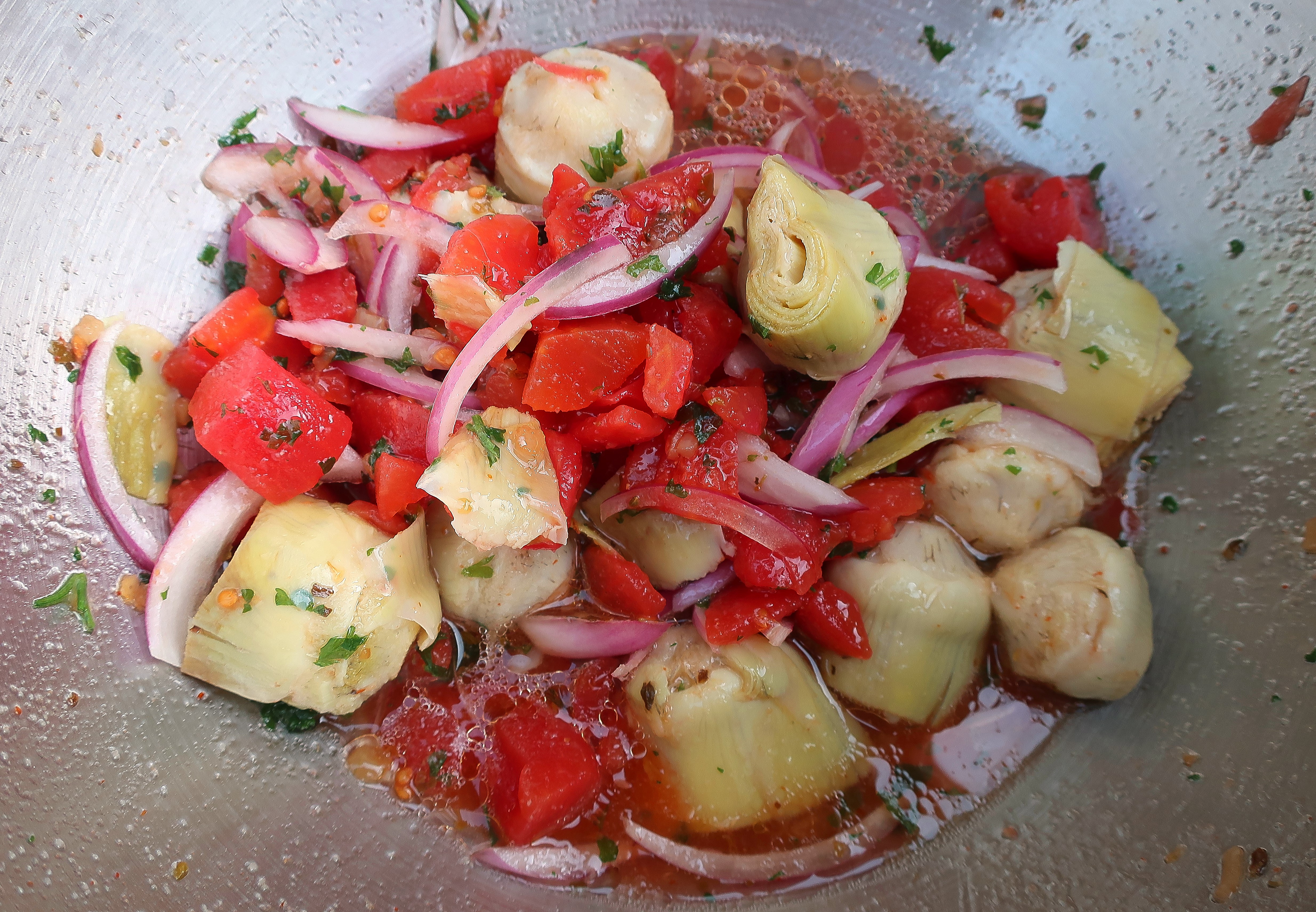 Grilled Salmon With Artichokes, Red Onions & Tomatoes Marinated In Raspberry Vinaigrette ← Previous Next → season 10 ea artichoke hearts, 1/2 med size red onion and 6 oz peeled, seeded and diced tomatoes in 1/3 cup raspberry vinaigrette overnight