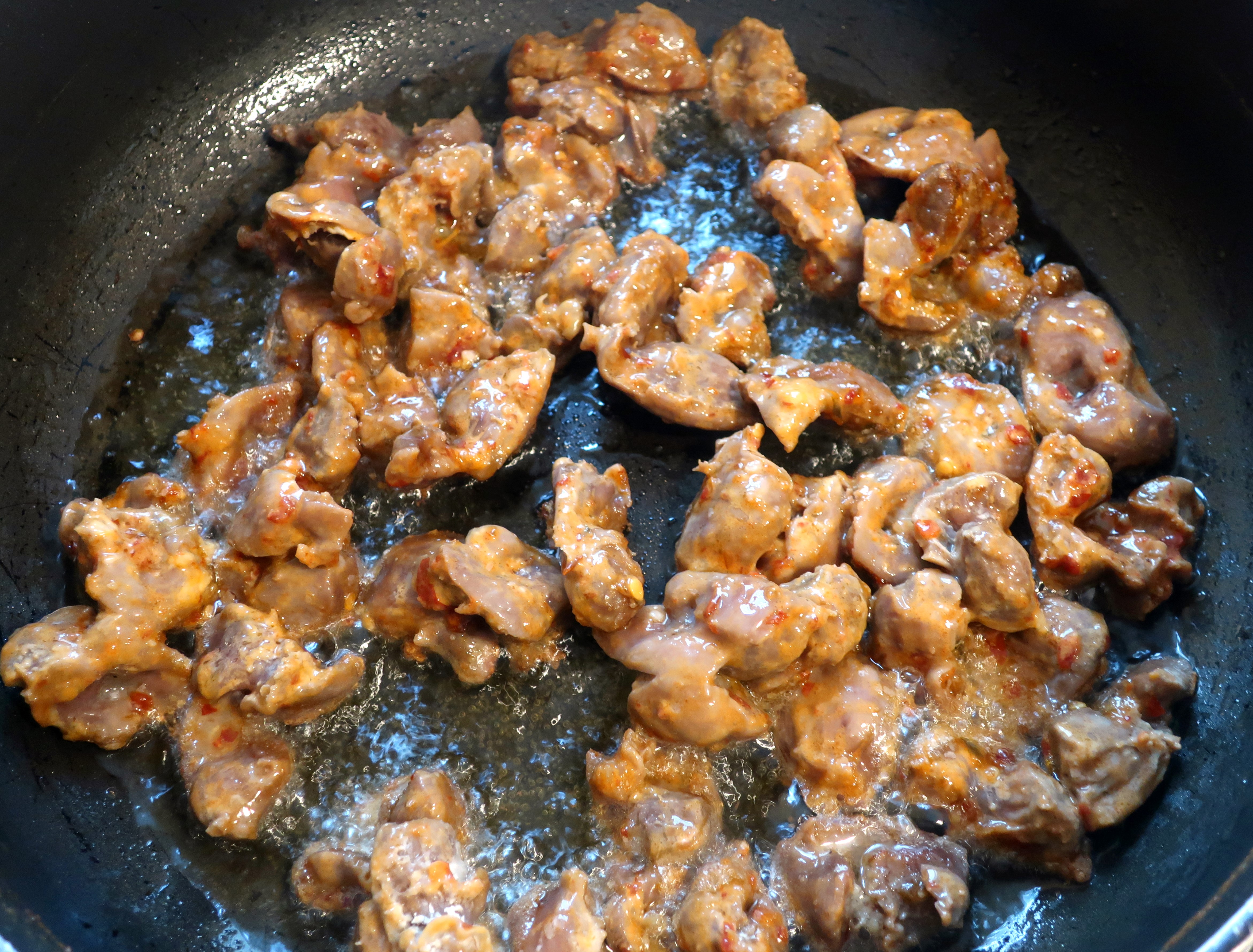 Salade De Gésiers (Romaine and Red Onions In Tarragon Vinaigrette With Chili Gizzards & Honey Garlic Yogurt) ← Previous Next → stir fry gizzards in 380F peanut oil until crisp and golden