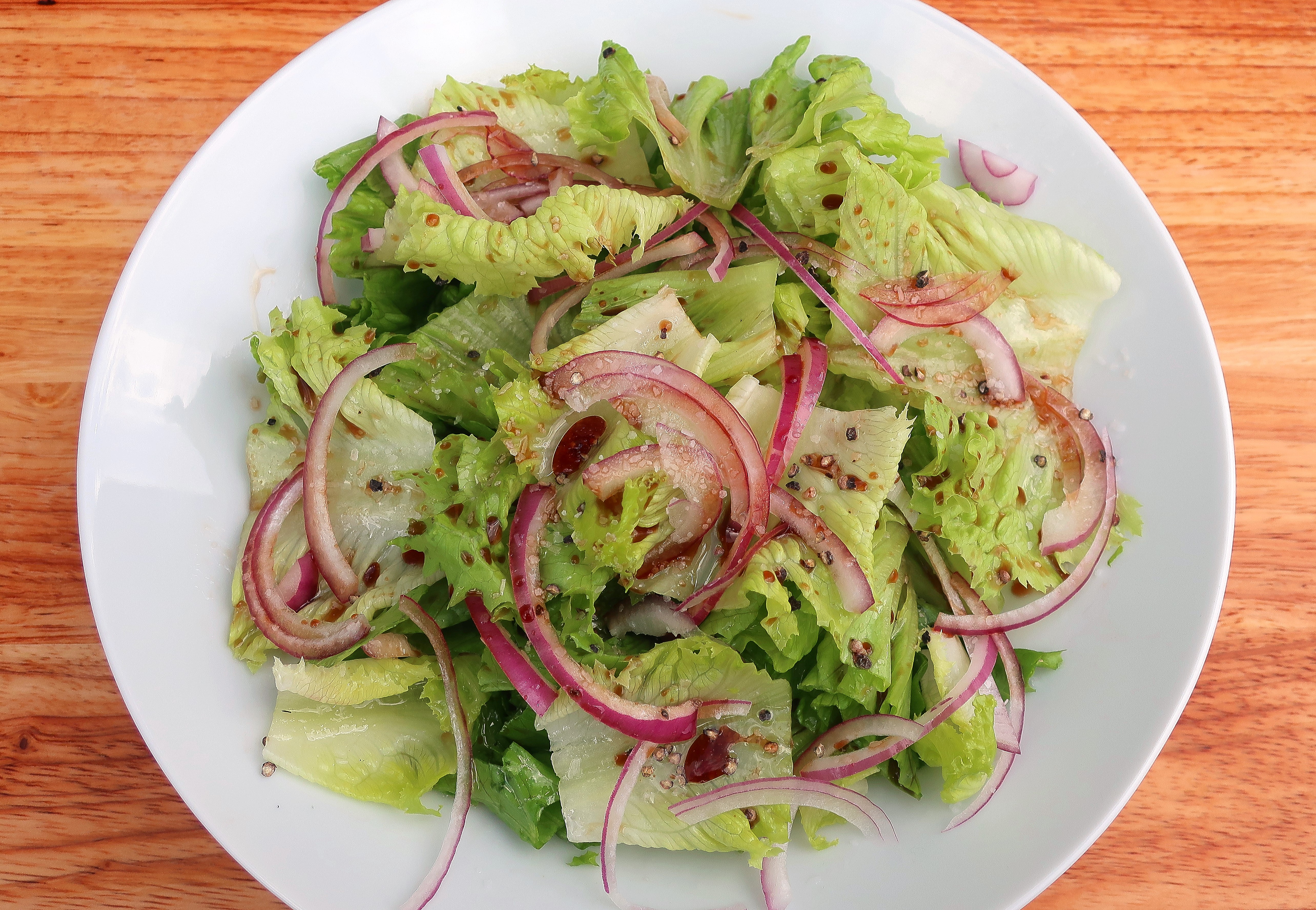 cut 1 small head of romaine lettuce into large pieces, add 1/2 medium size red onion, mix with 3 tblsp tarragon dressing, arrange on a serving plate, sprinkle with fresh-ground black pepper corn